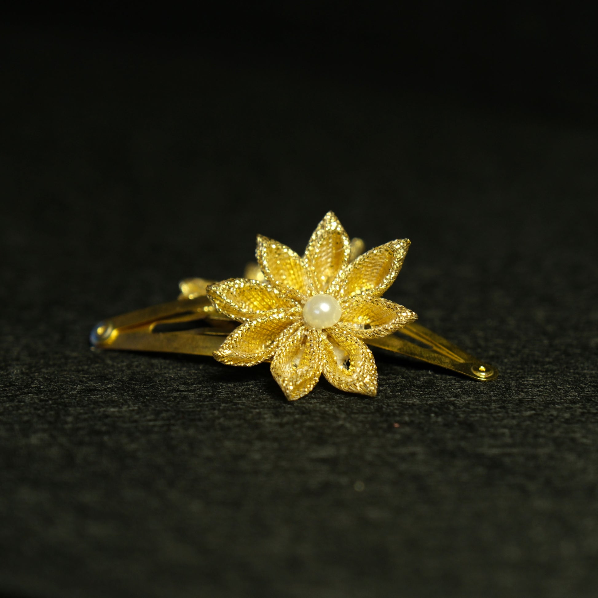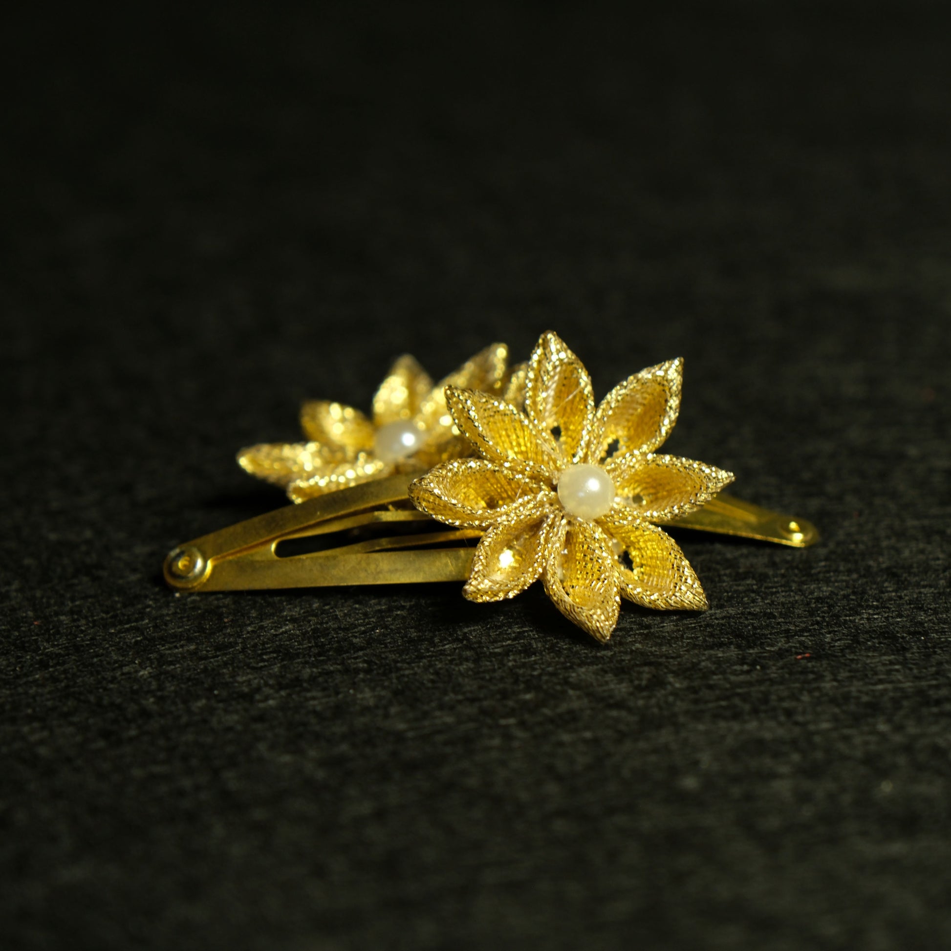 Aukso spalvos blizgančios mini gėlytės ant segtuko.