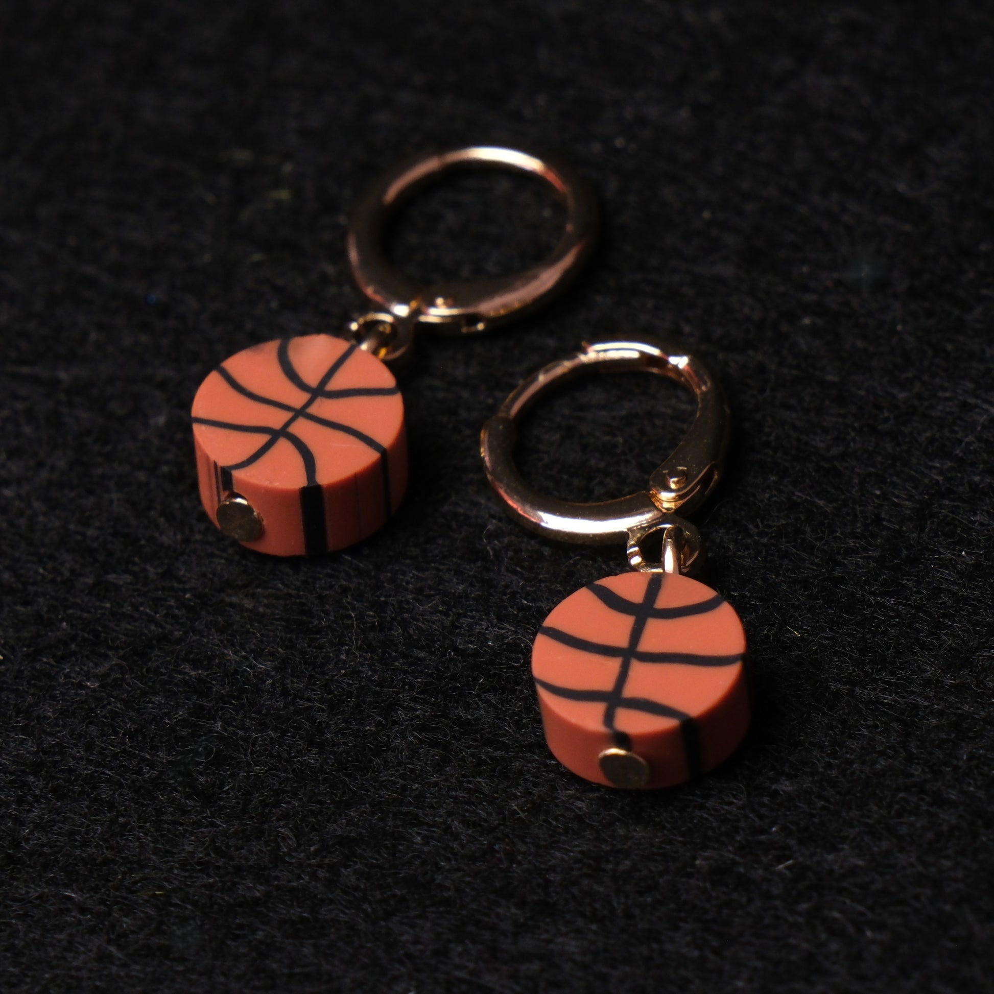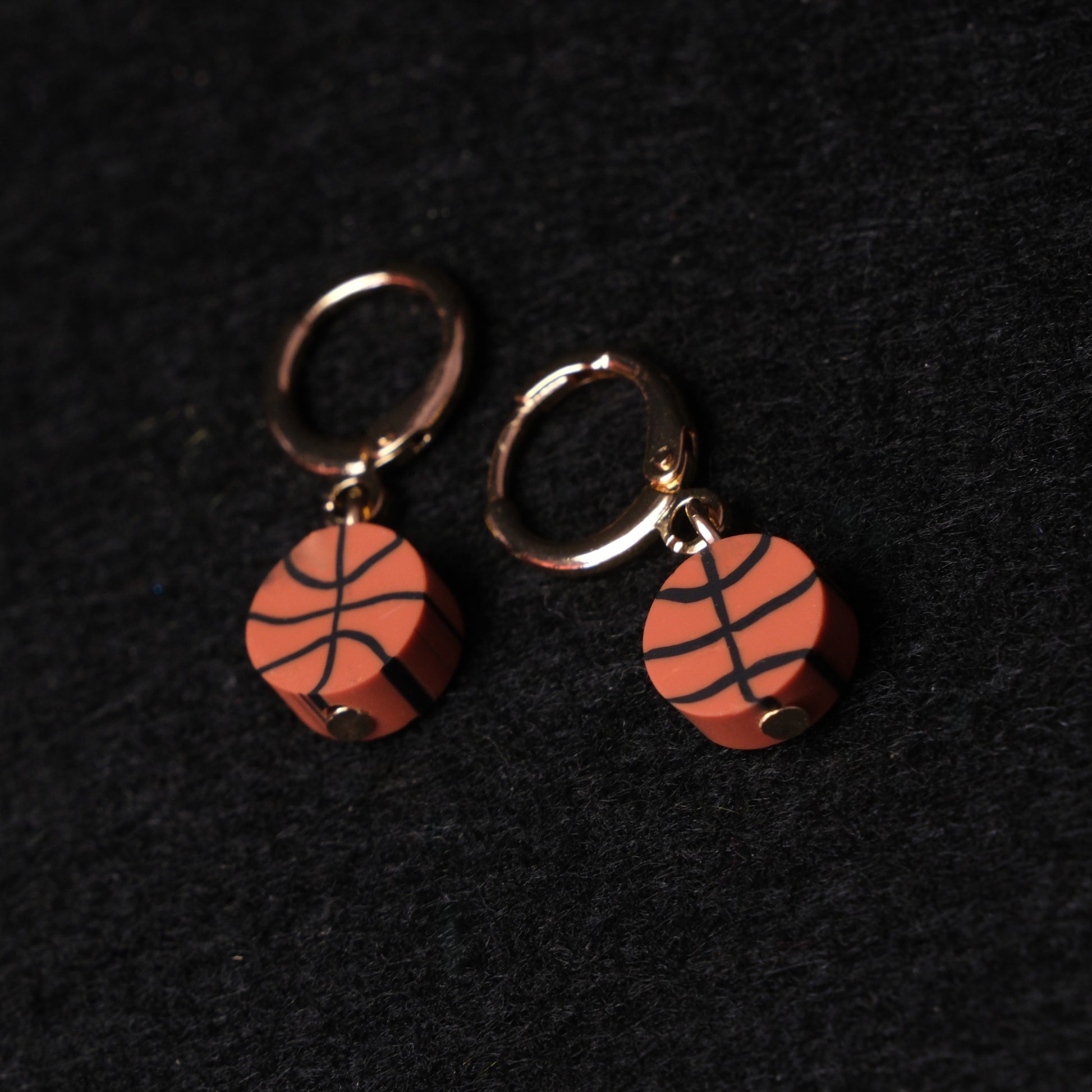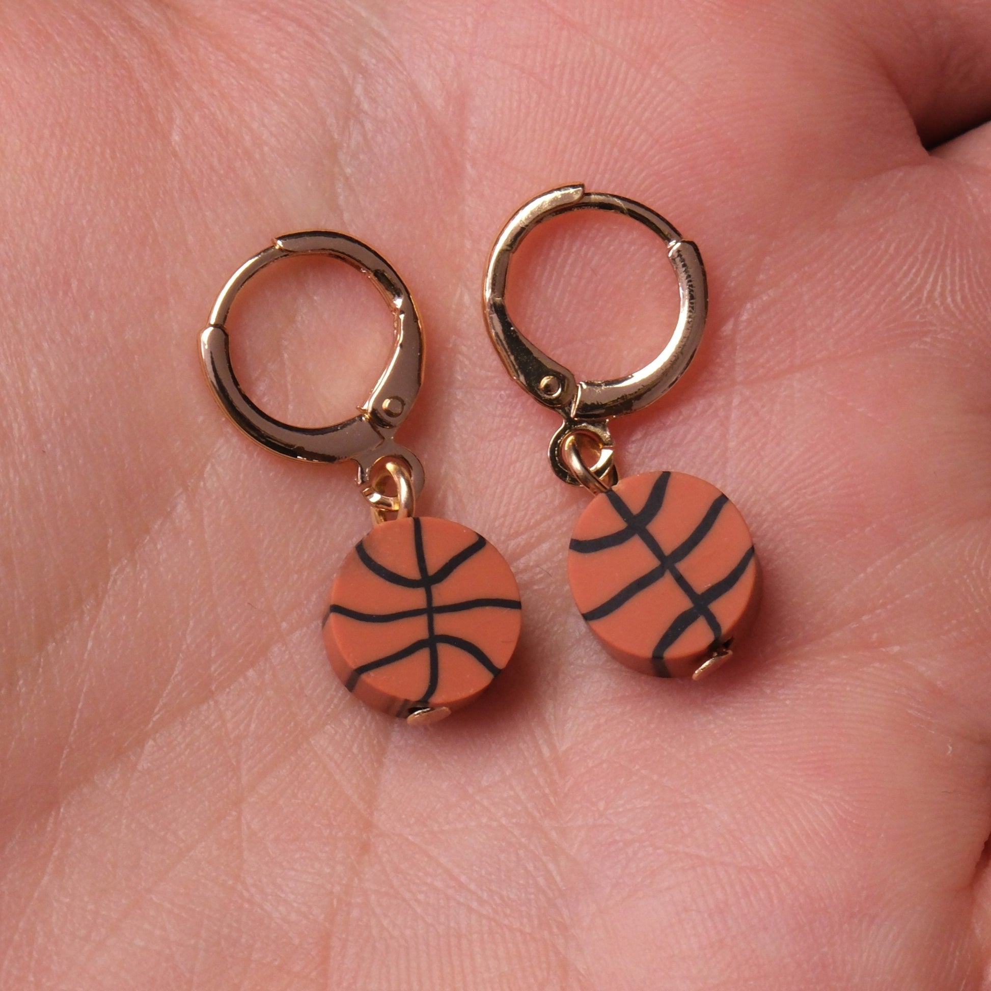 Auskarai su polimerinio molio krepšinio kamuoliu.