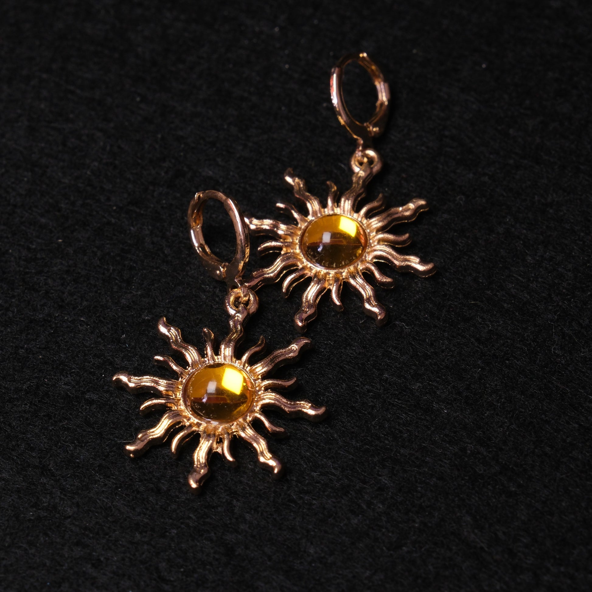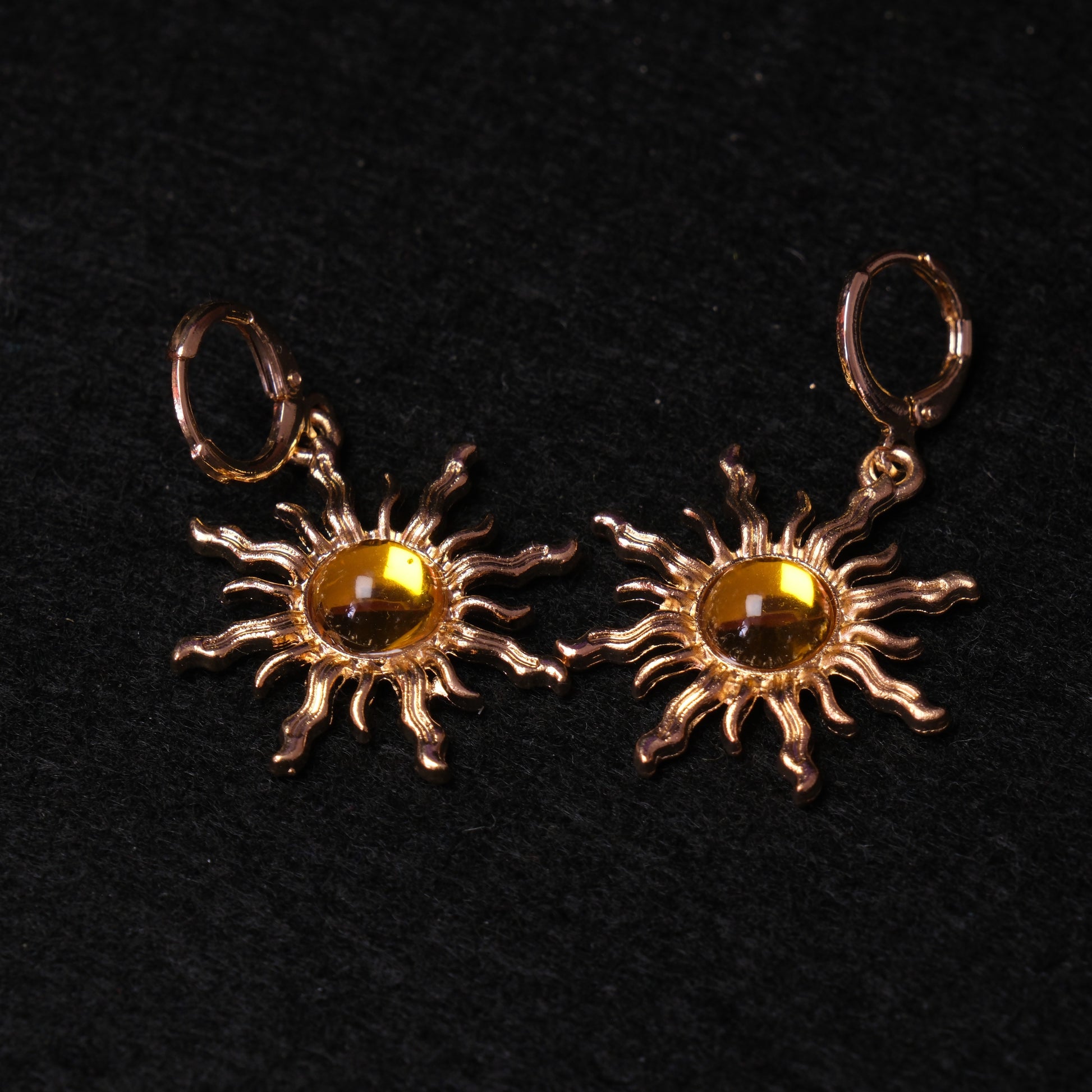 Aukso spalvos saulės auskarai su geltonos spalvos akmenuku