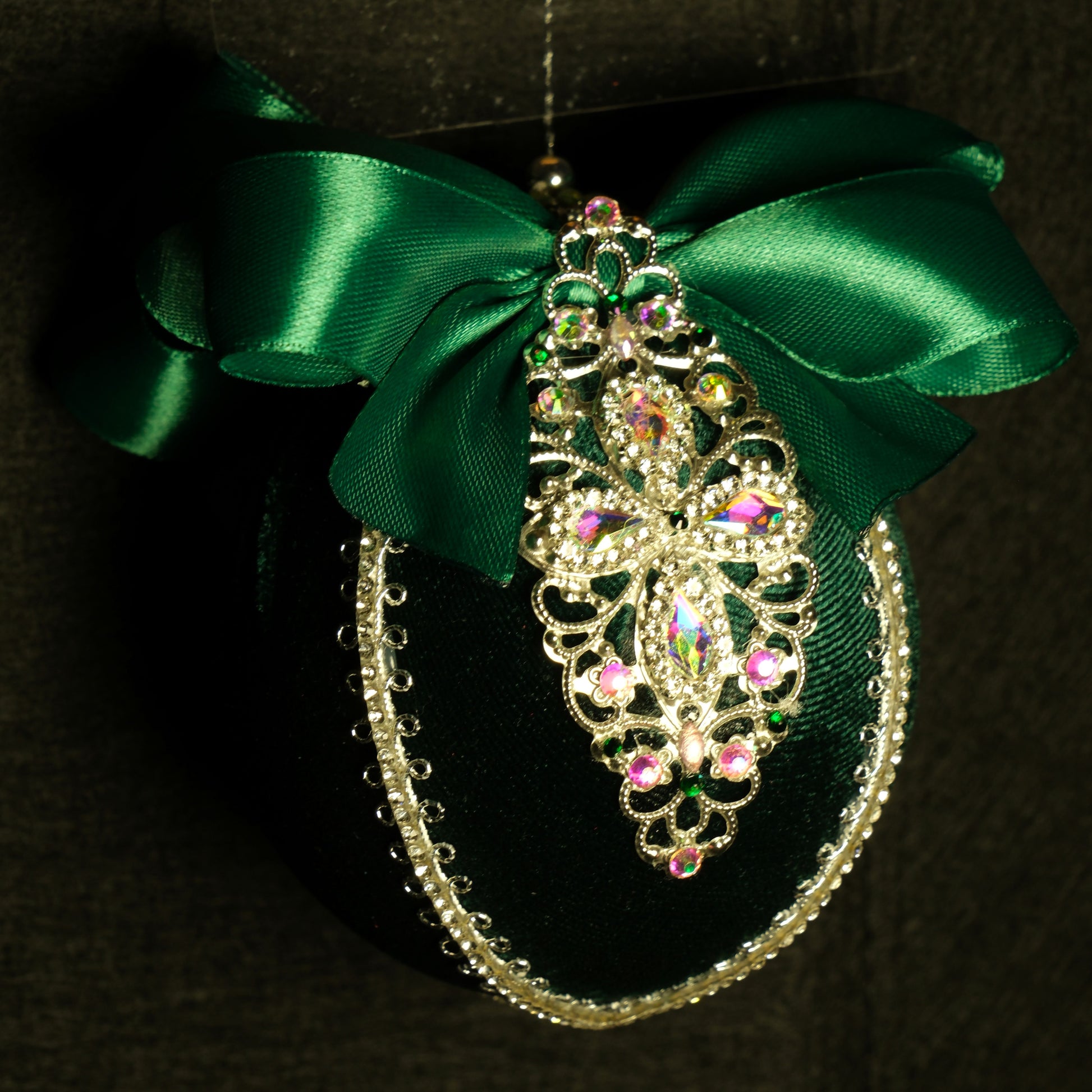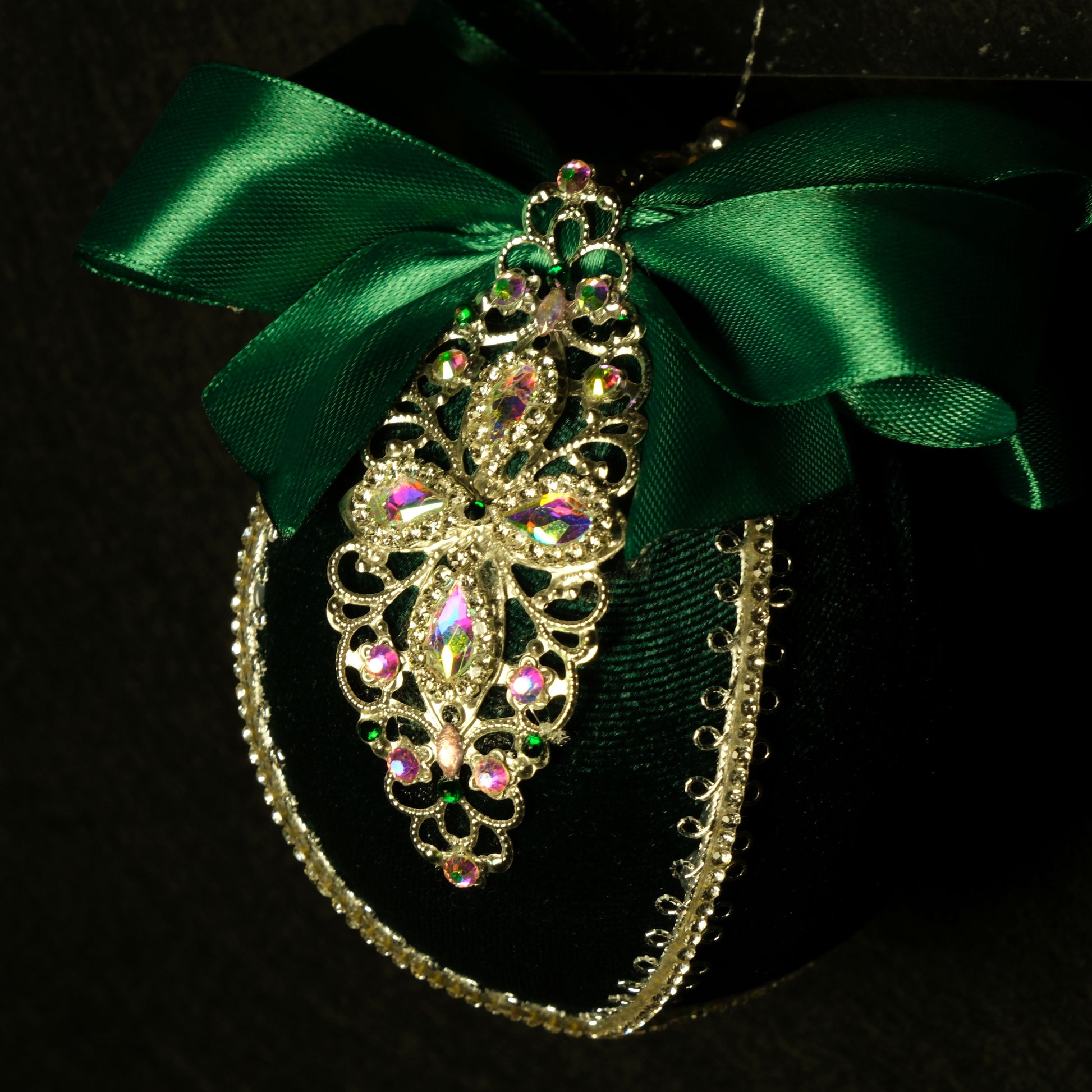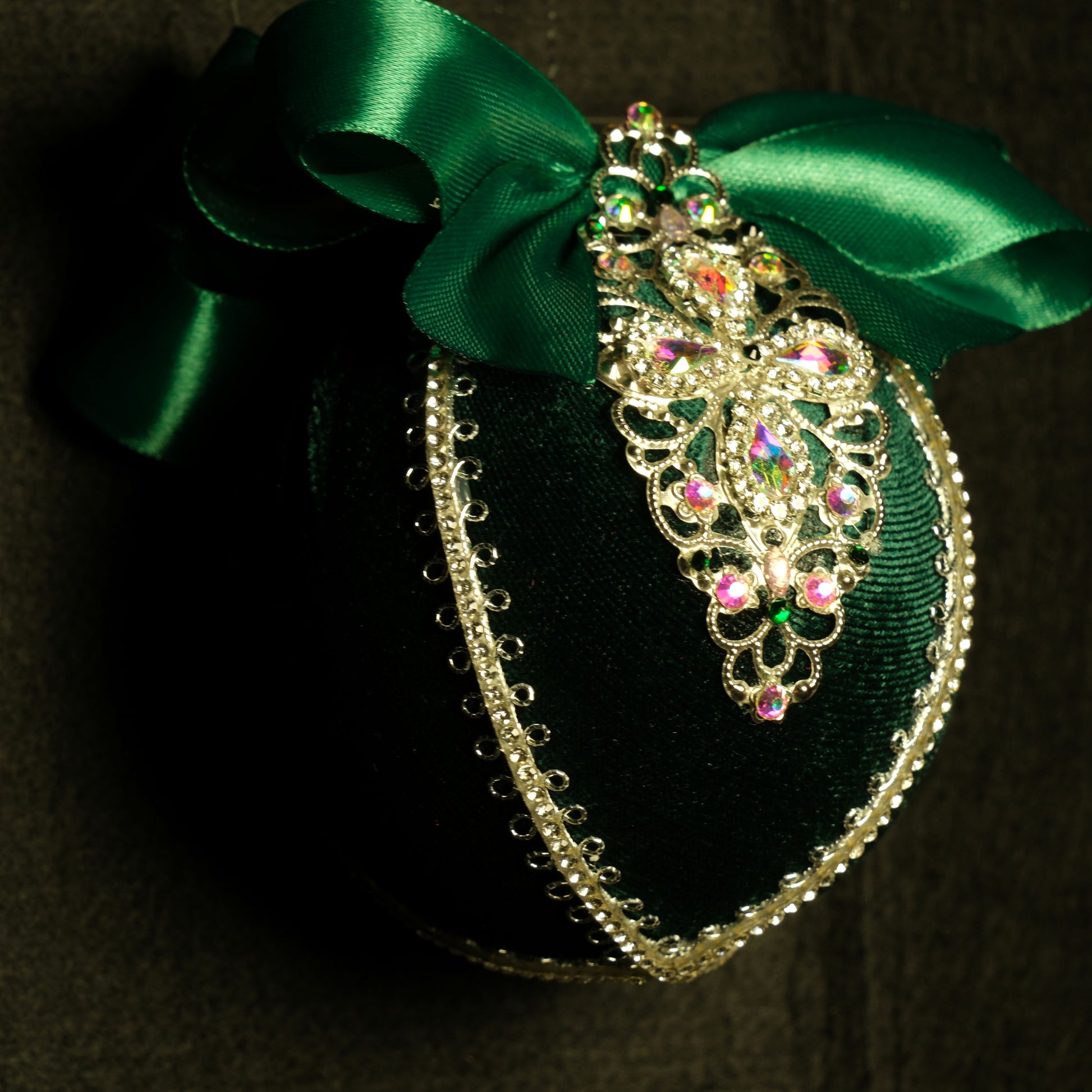 Veliūrinis tamsiai žalios spalvos eglutės žaisliukas su žėrinčiais akmenėliais ir sidabro spalvos detalių ornamentais.
