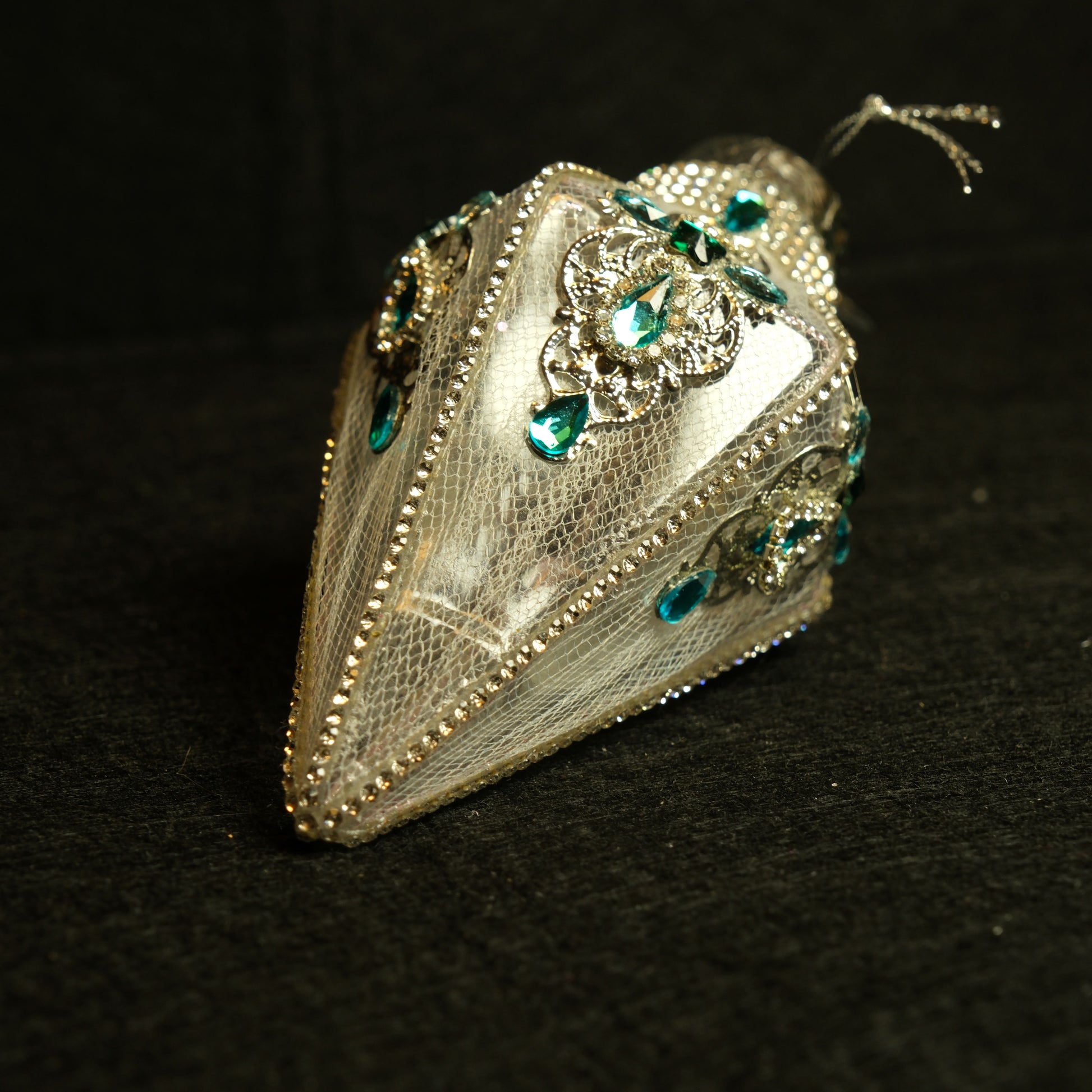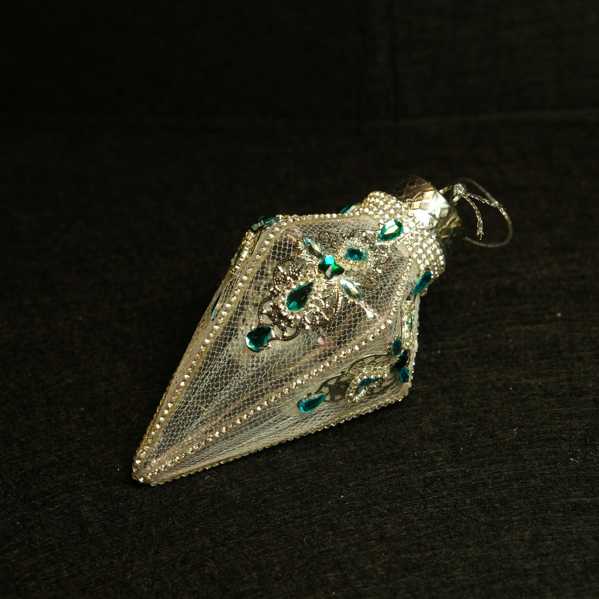 Kristalo formos eglutės žaisliukas su žėrinčiais akmenėliais ir sidabro spalvos detalių ornamentais.