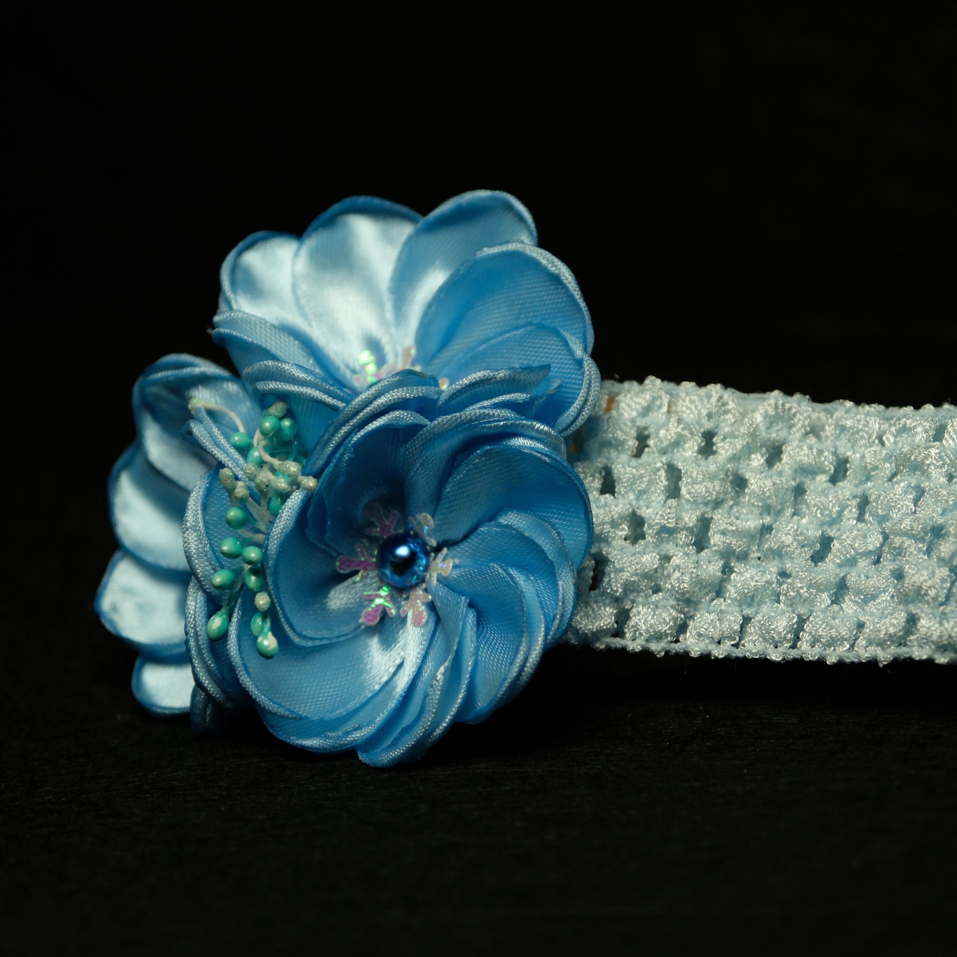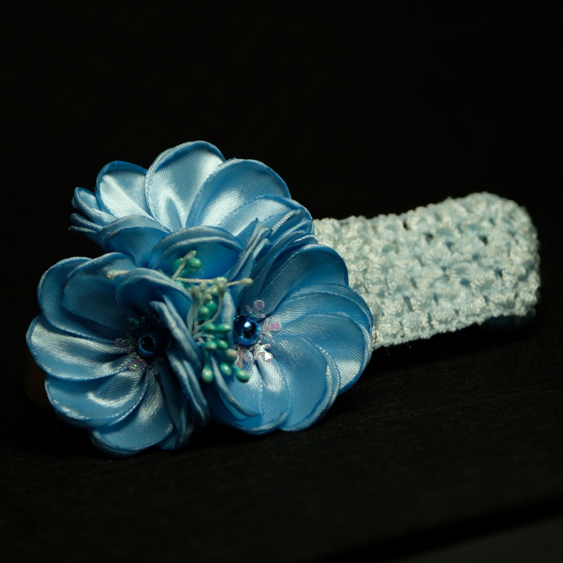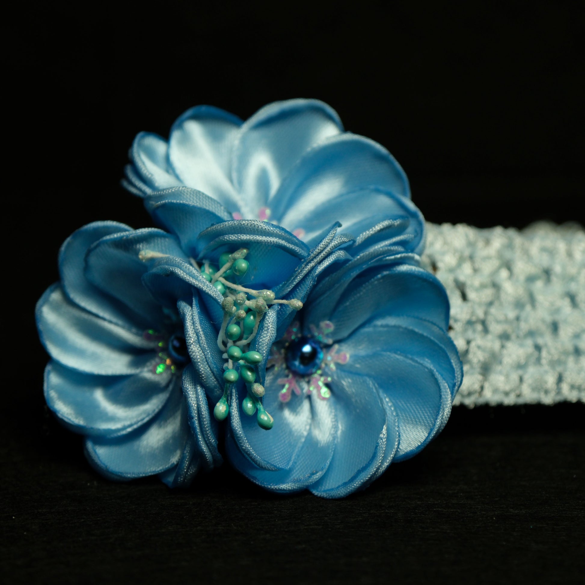 Žydros spalvos galvajuostė su trijų gėlyčių puokštele