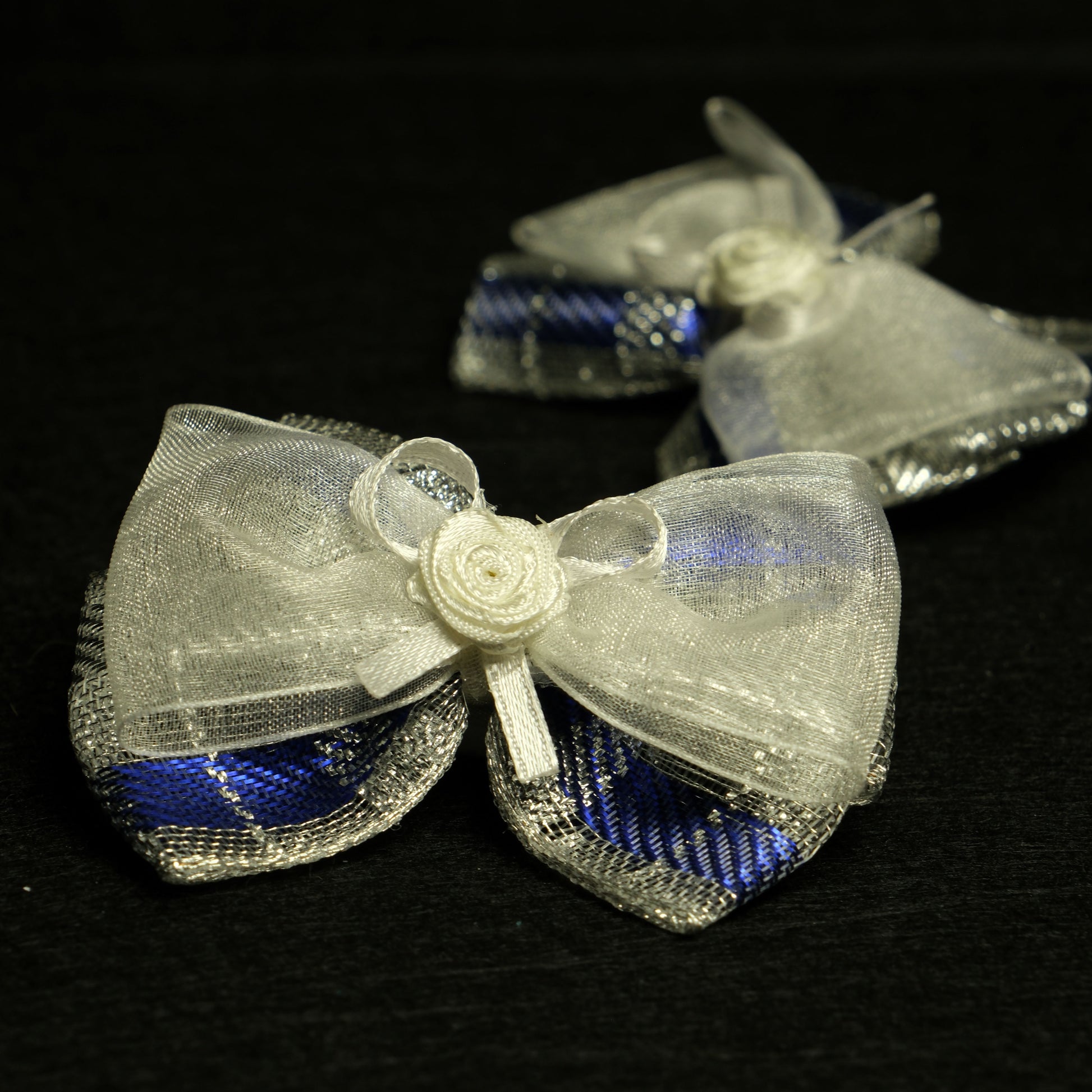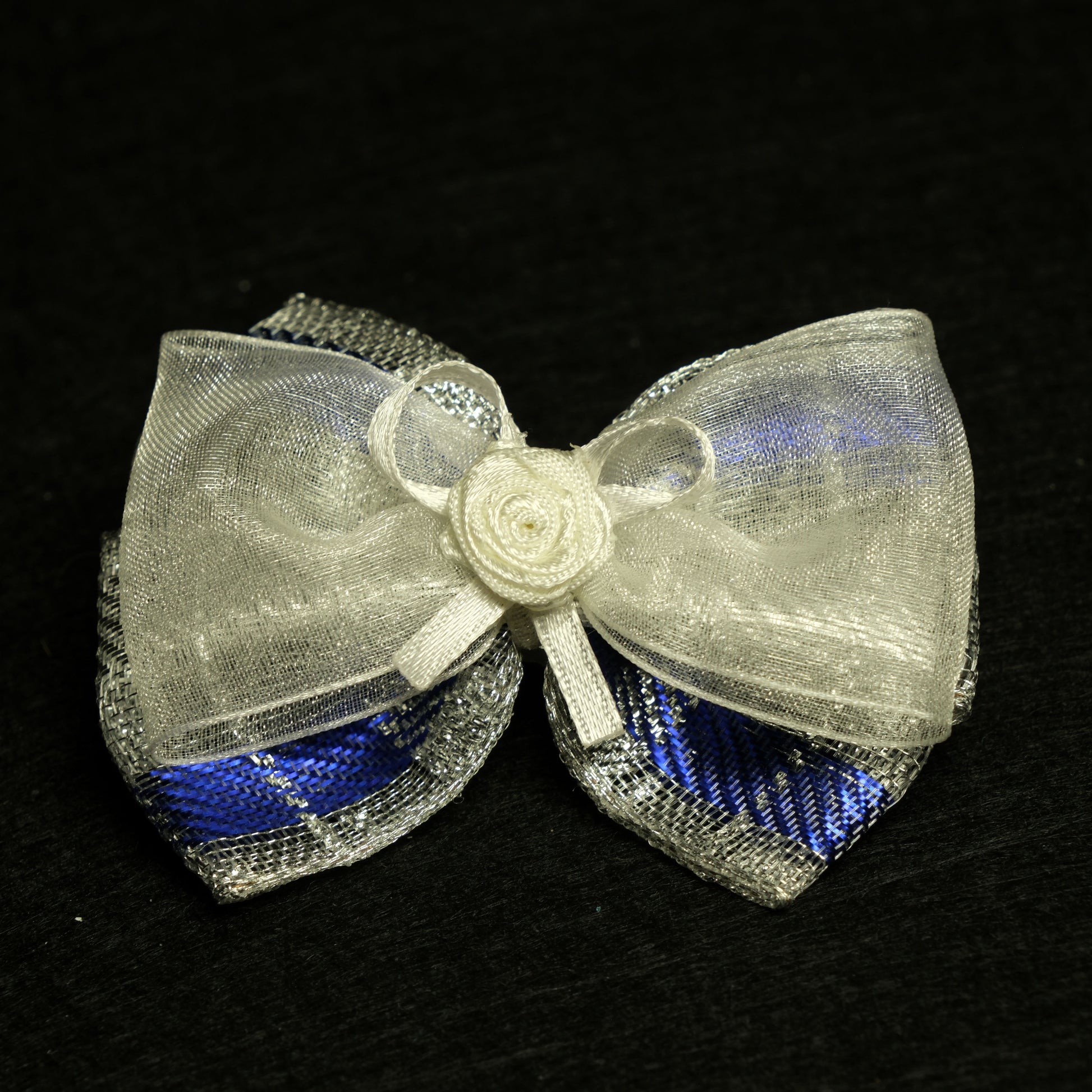 Baltos, mėlynos ir sidabro spalvos kaspinėlis su balta rožyte centre.