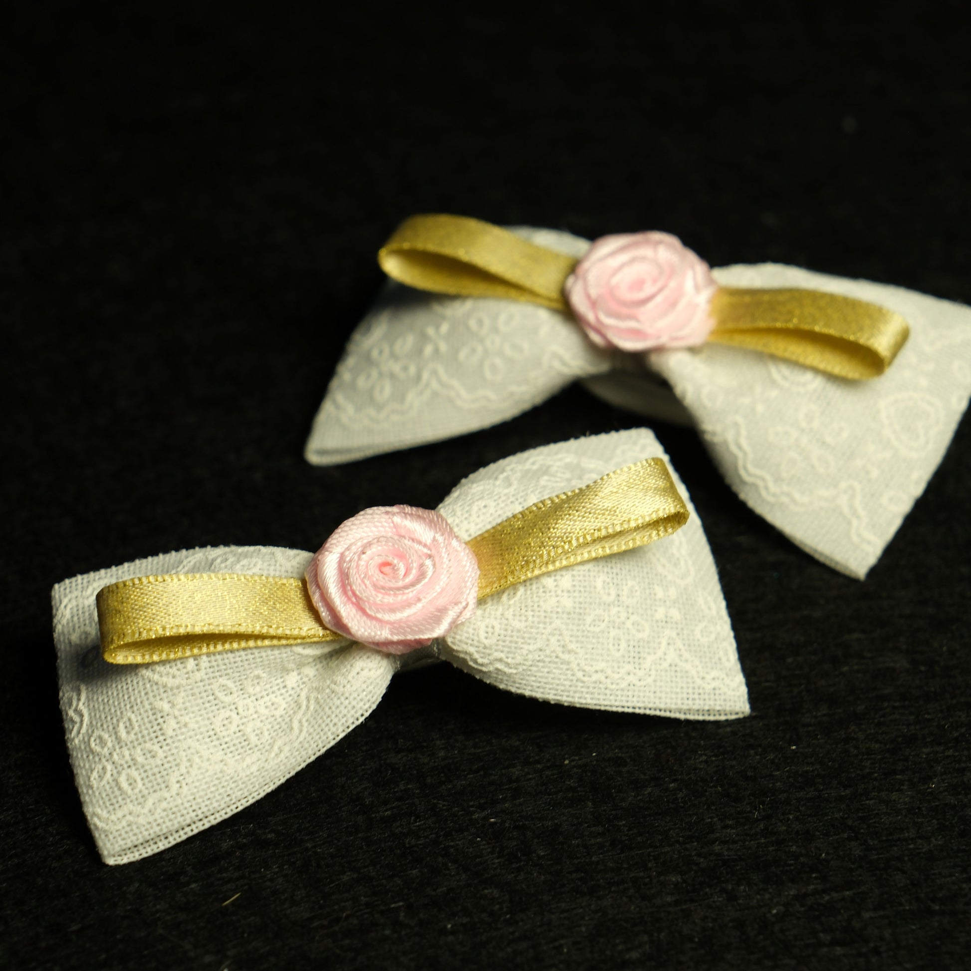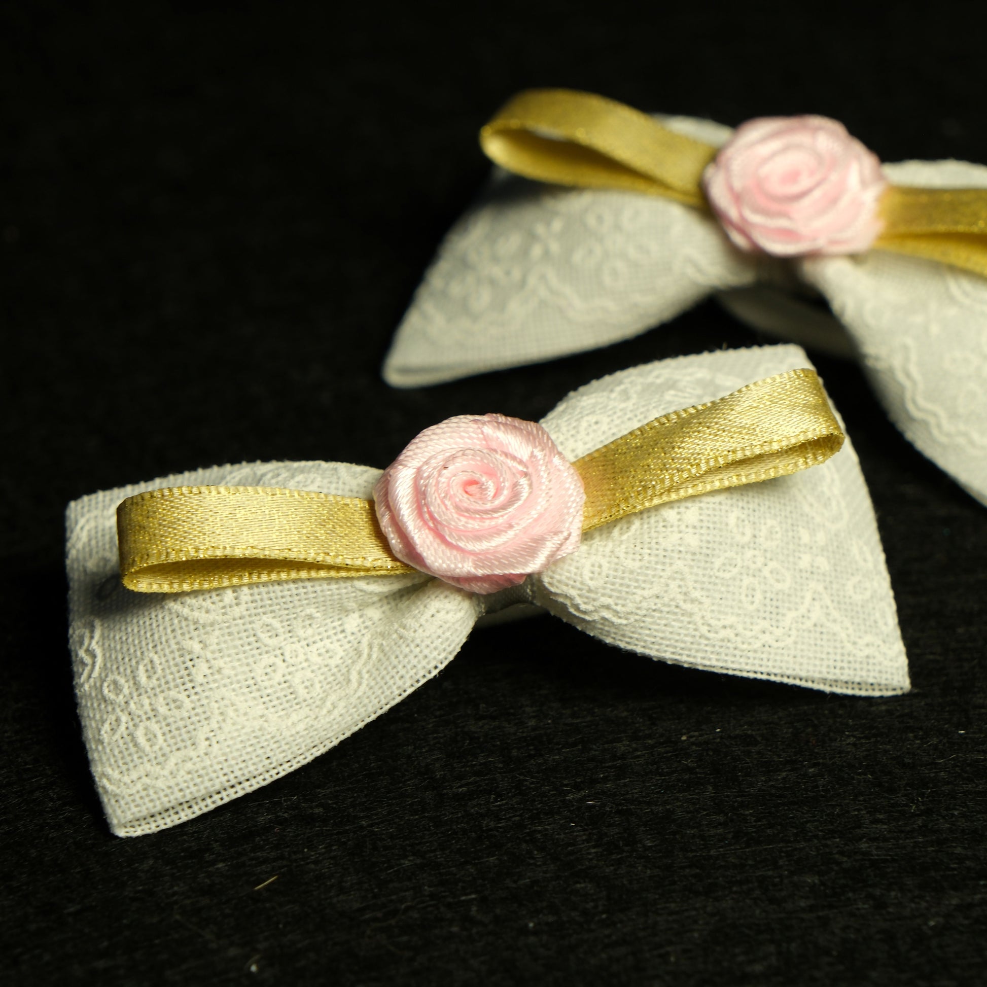Baltos spalvos kaspinėlis su raštais ir rožyte centre.