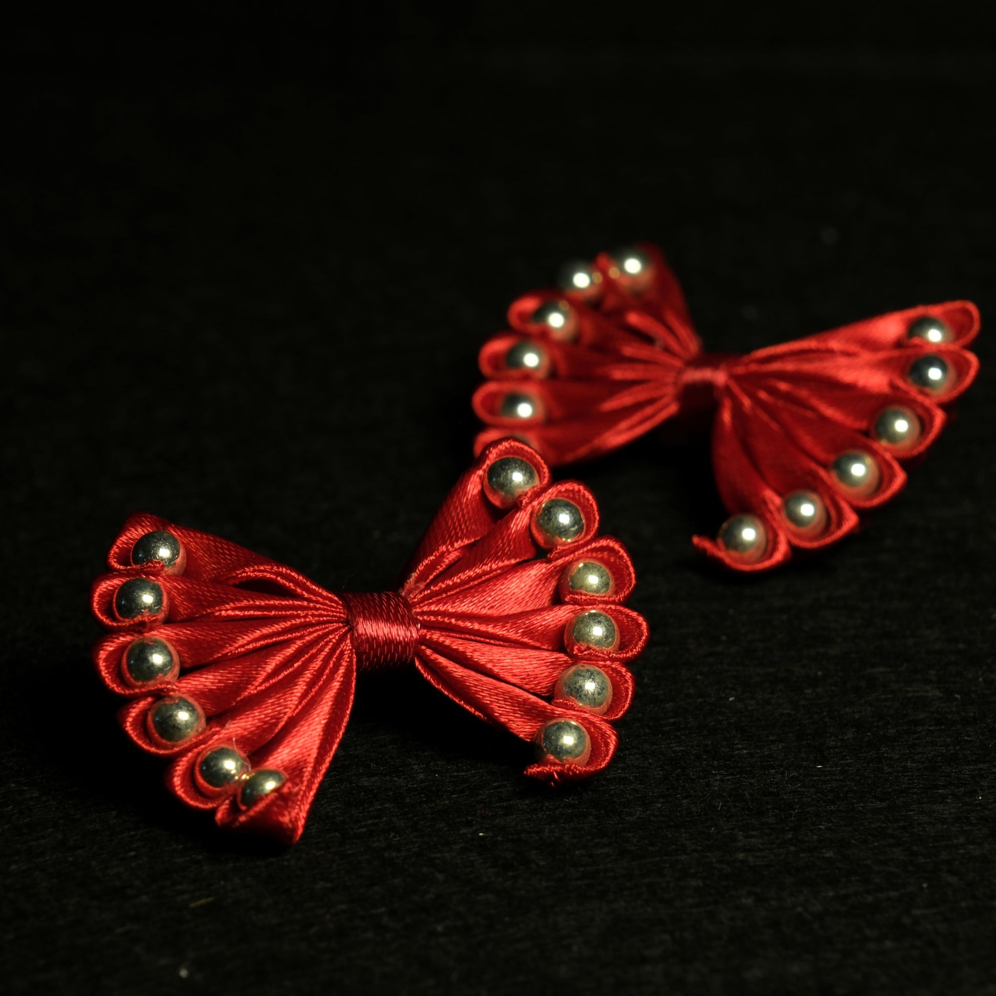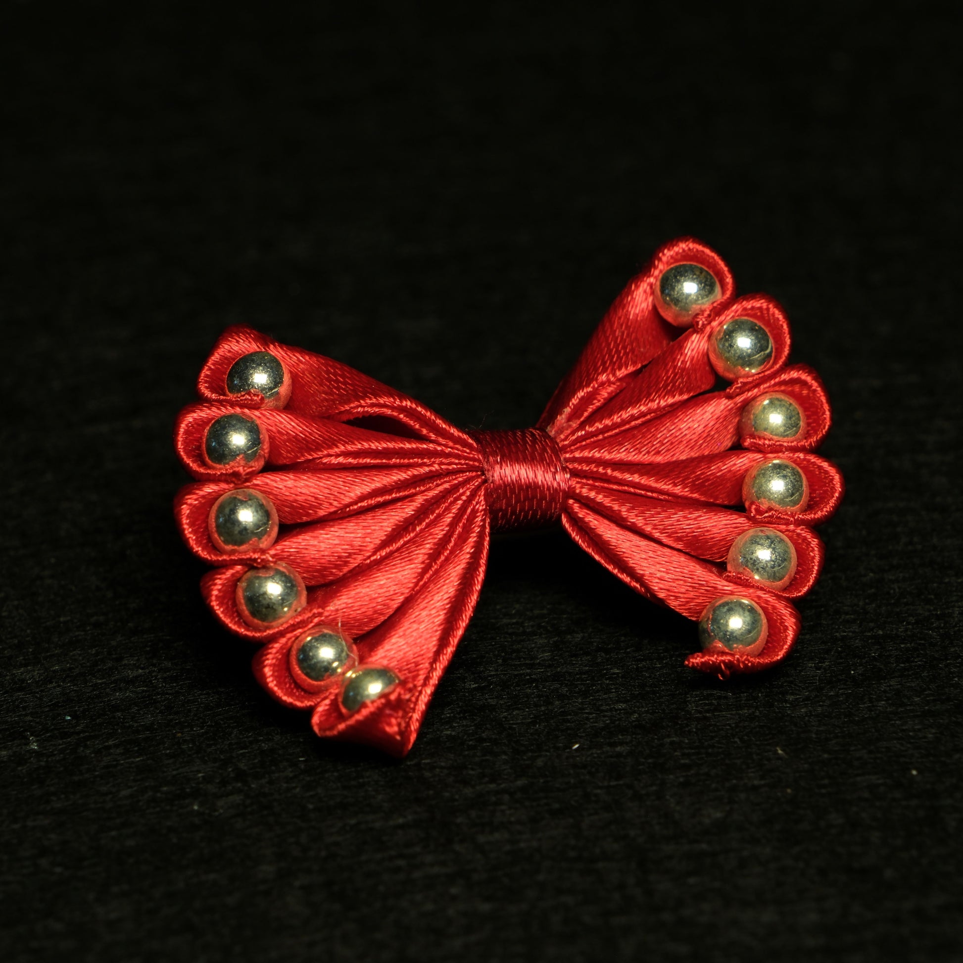 Ryškus raudonos spalvos kaspinėlis su karoliukais.