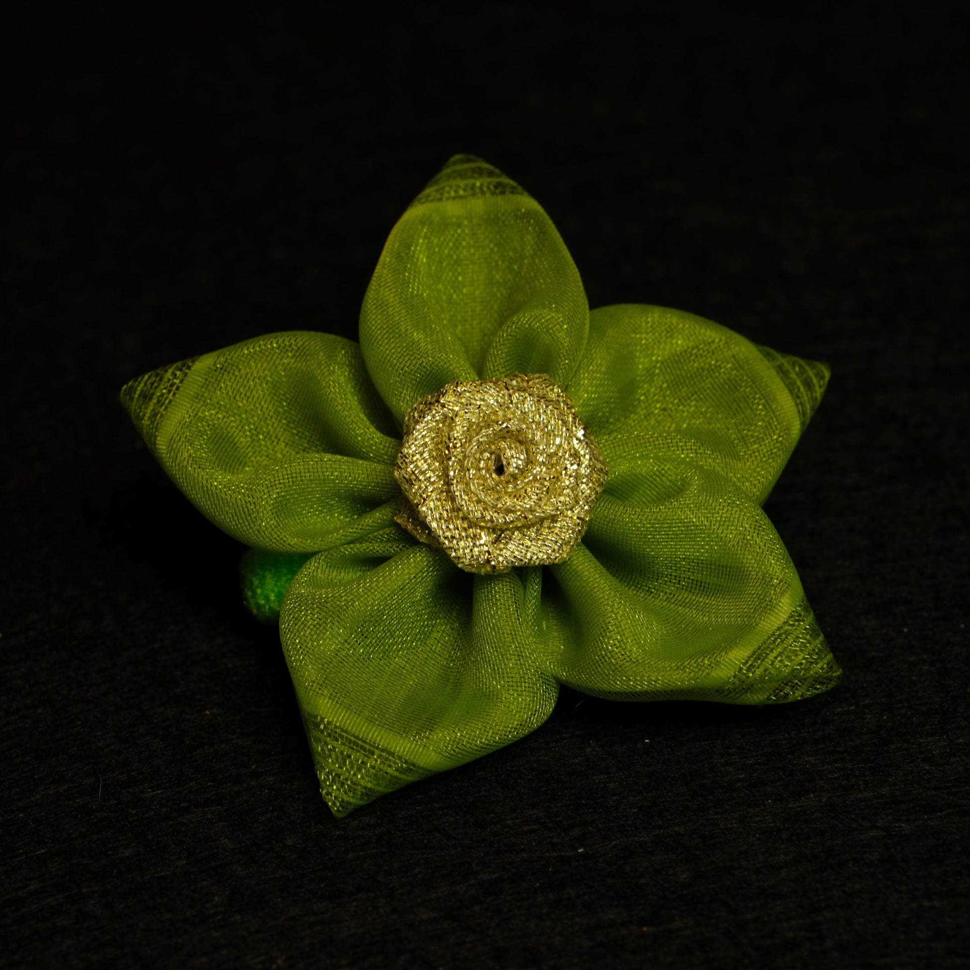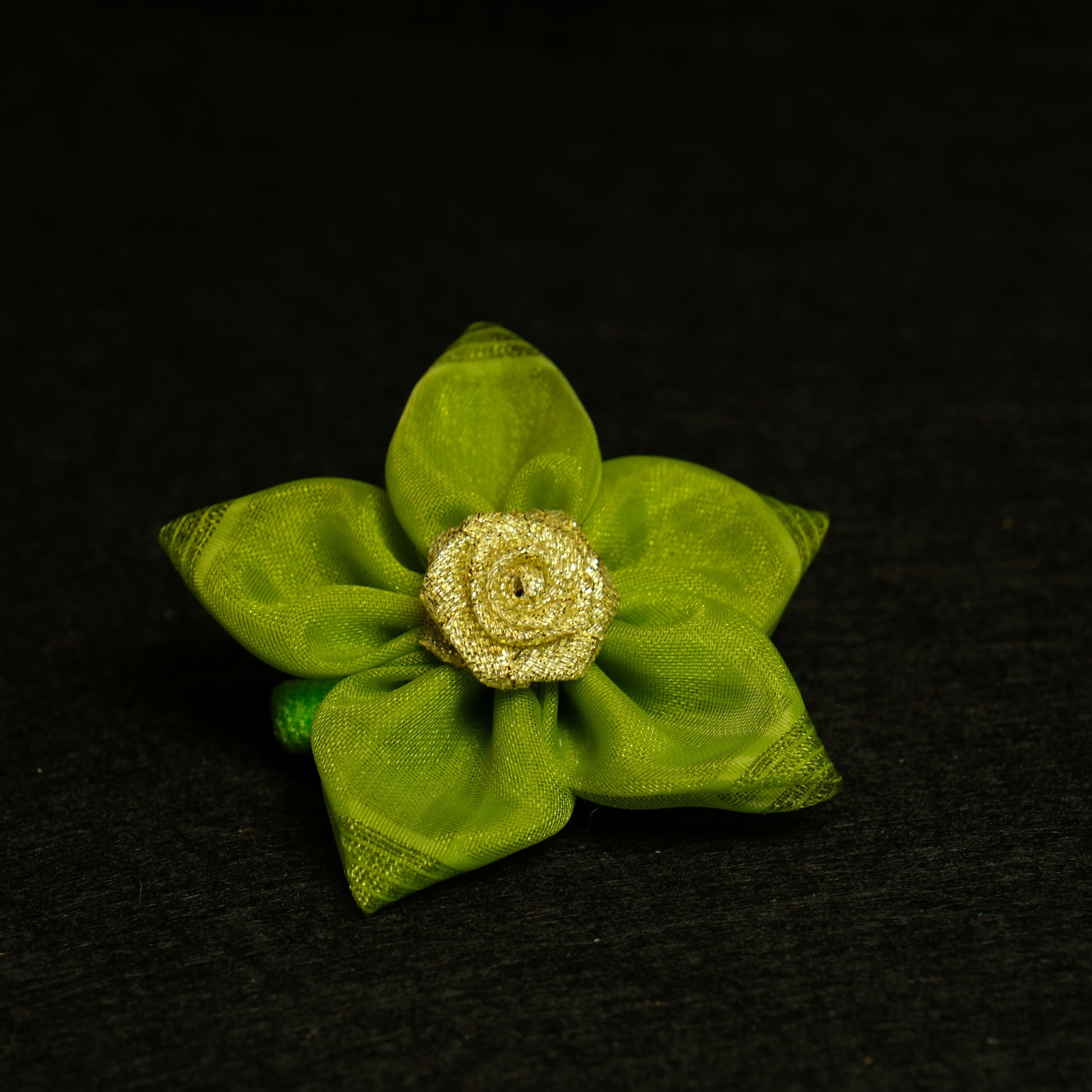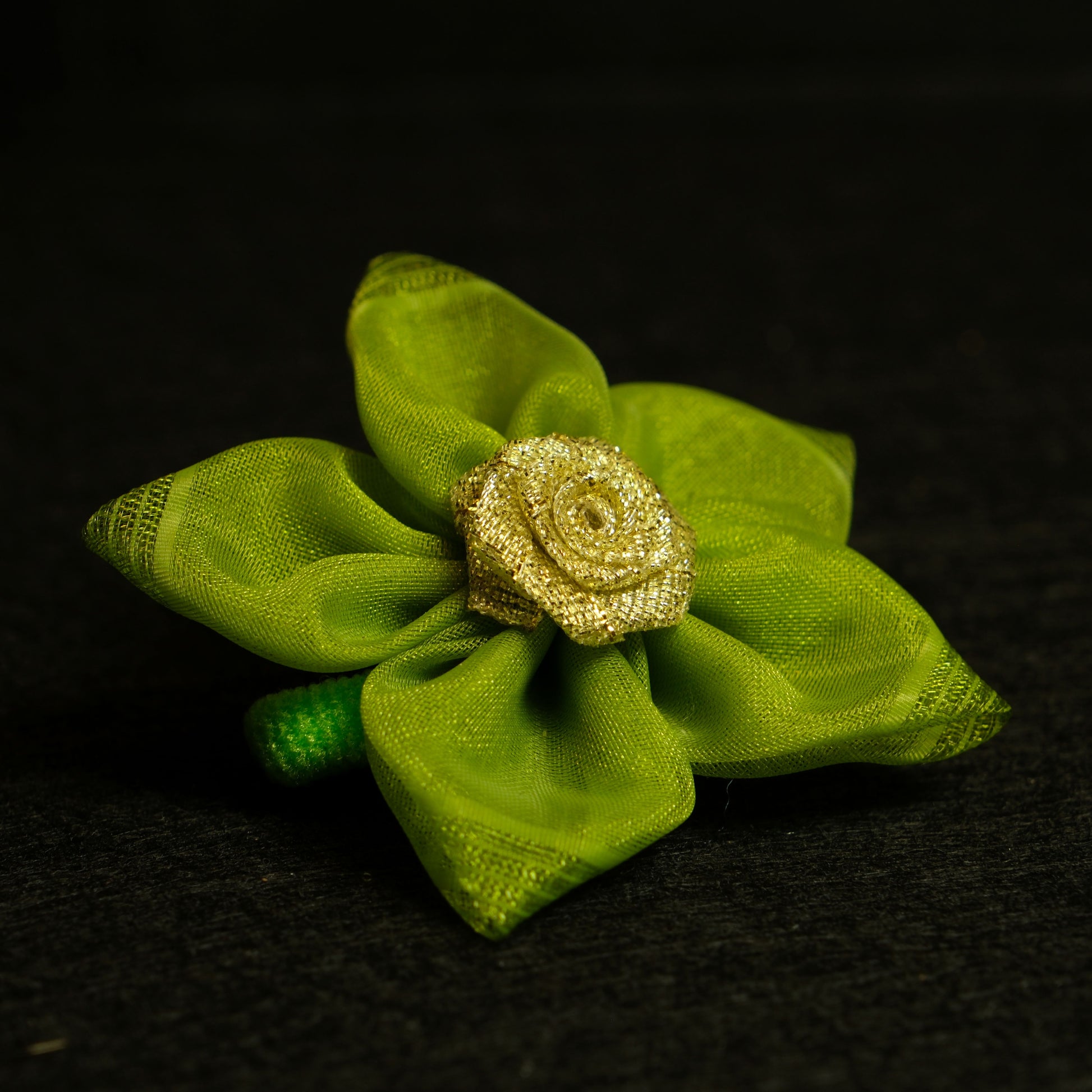 Žalios spalvos gumytė gėlytė su aukso spalvos rožyte viduryje.
