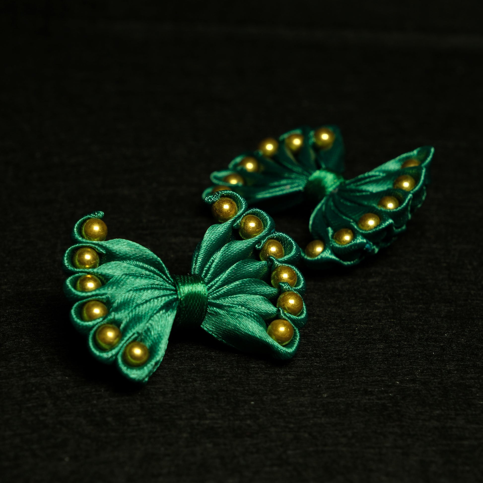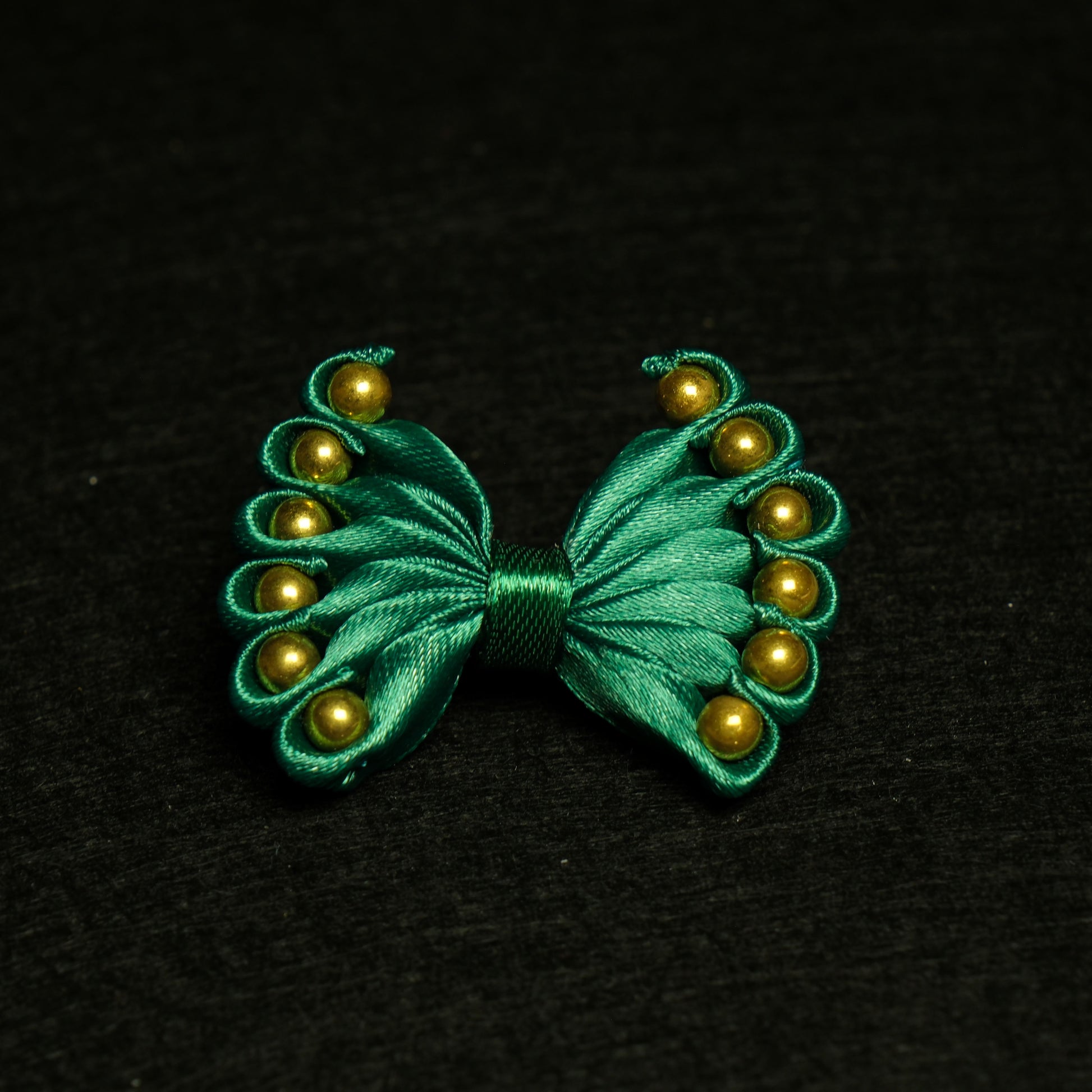 Tamsiai žalios spalvos kaspinėlis su karoliukais.