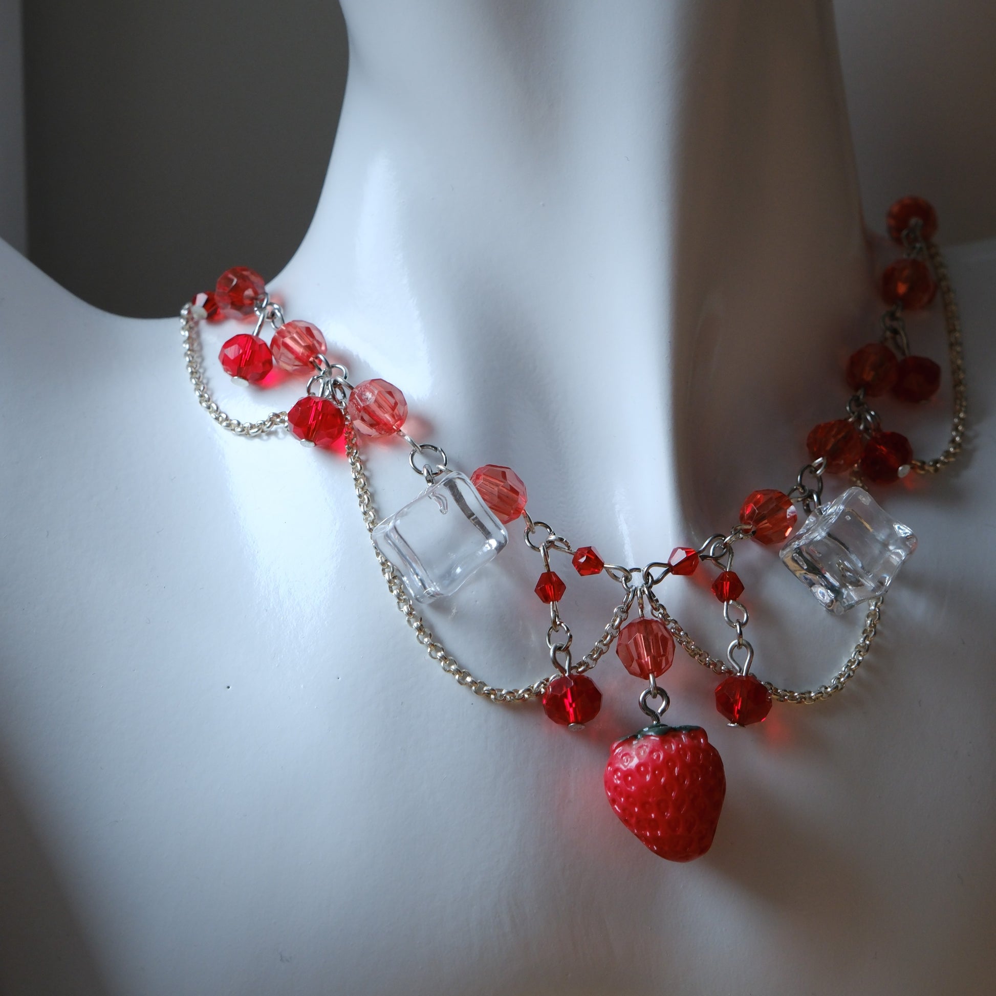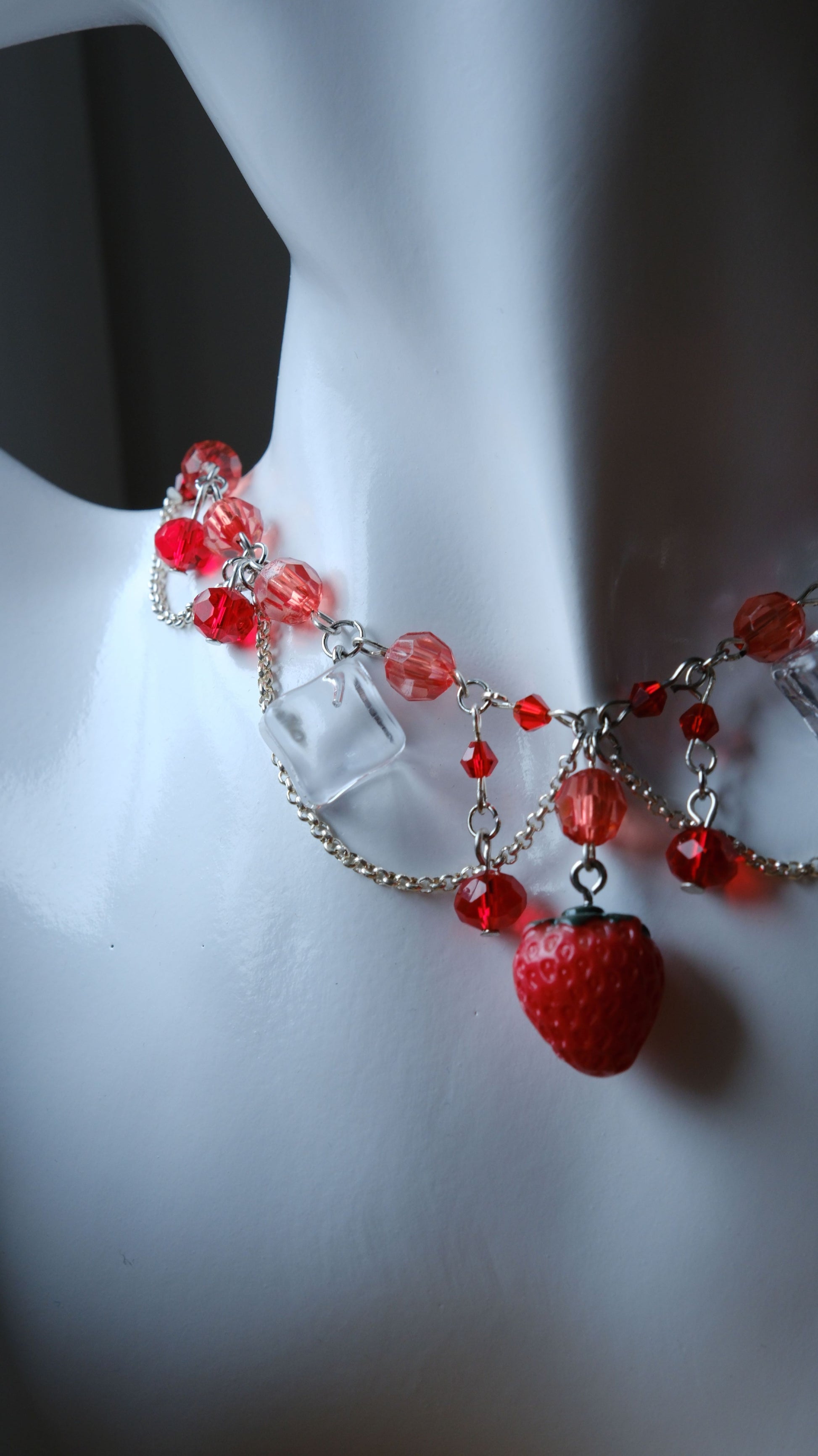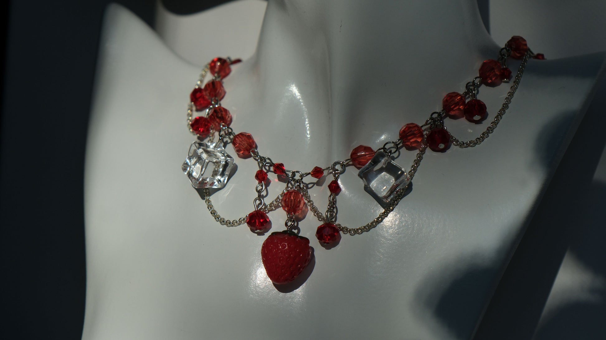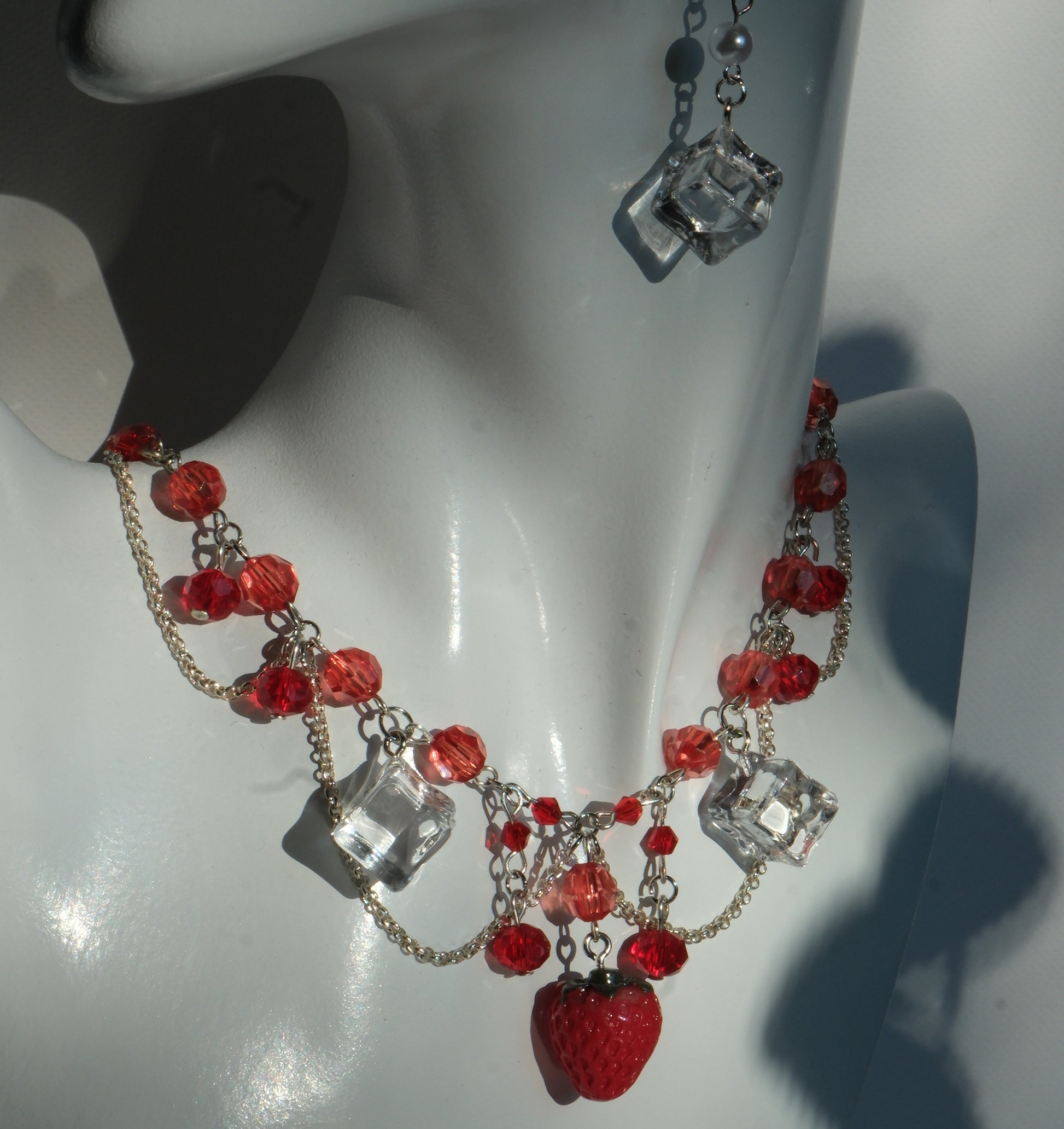 Raudonų karoliukų vėrinys su skaidriomis ir metalinėmis detalėmis.