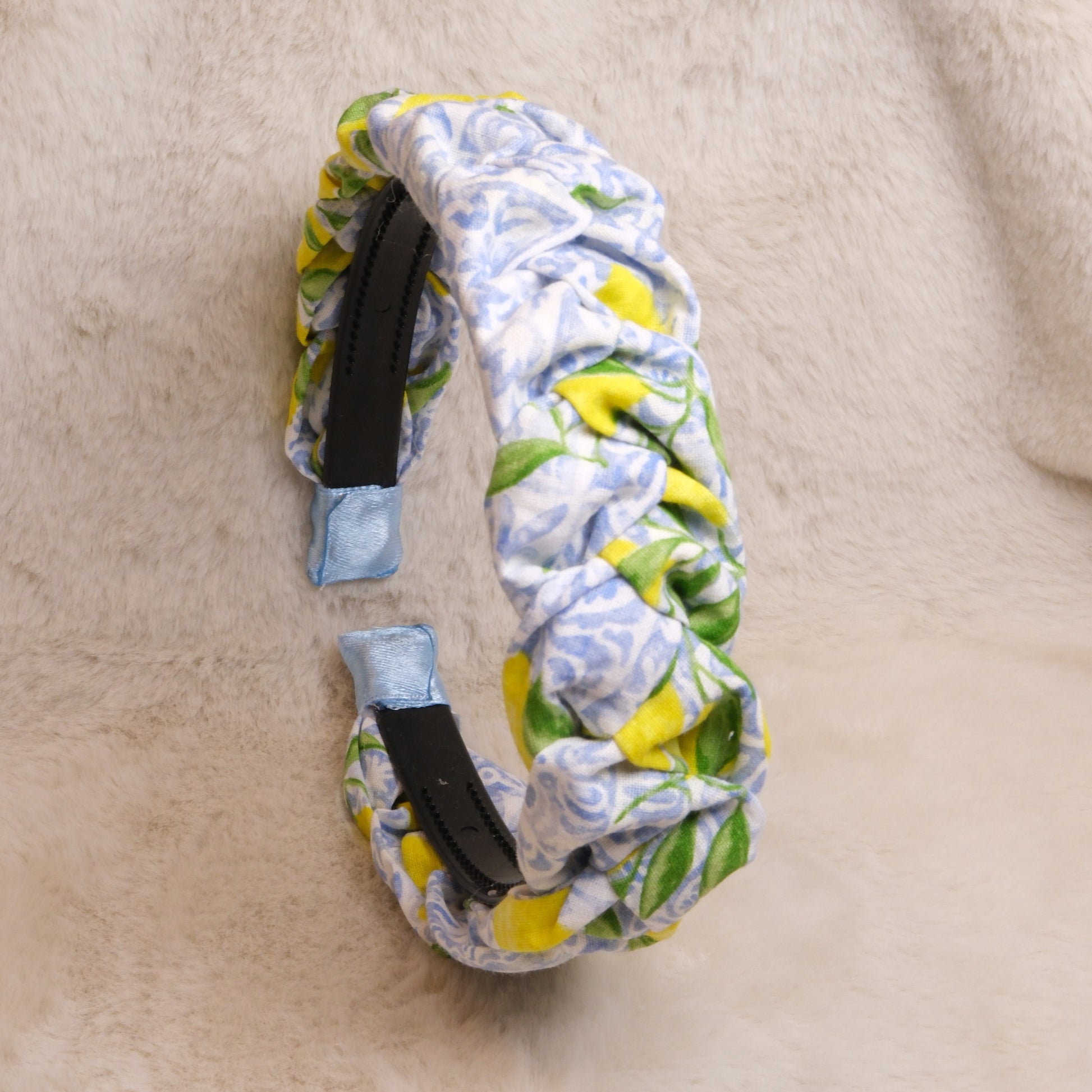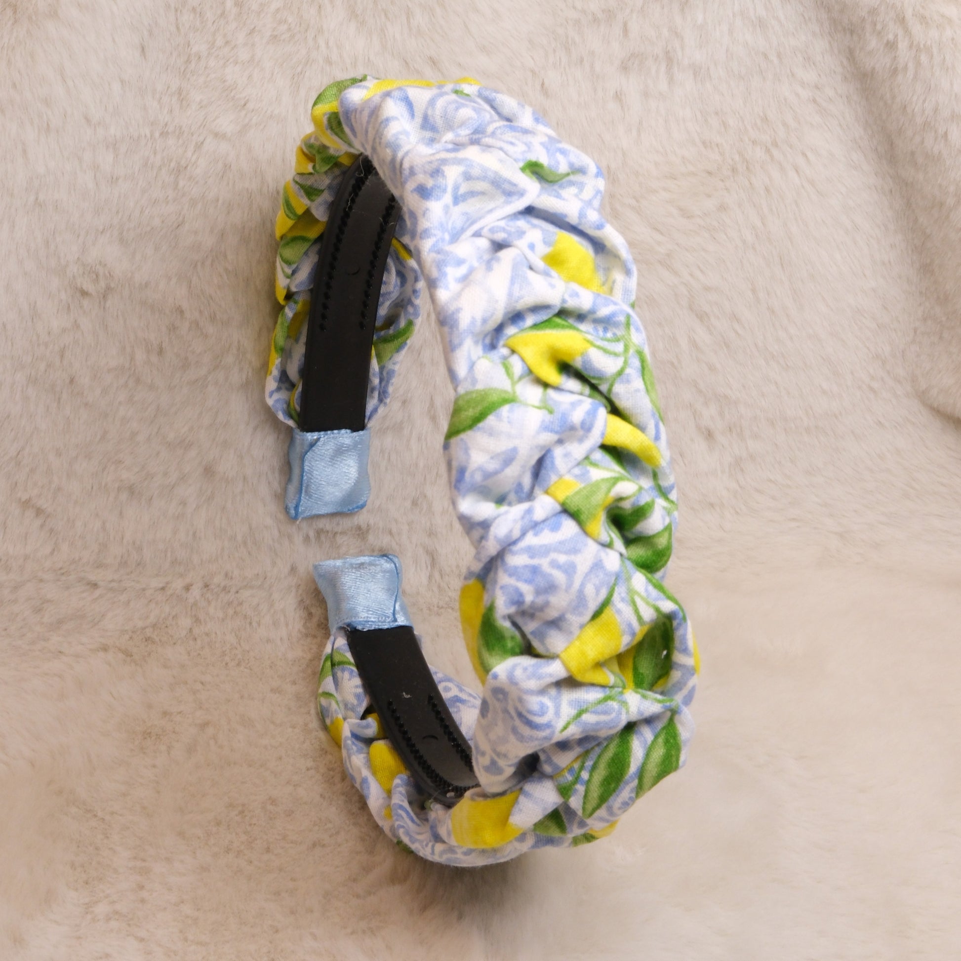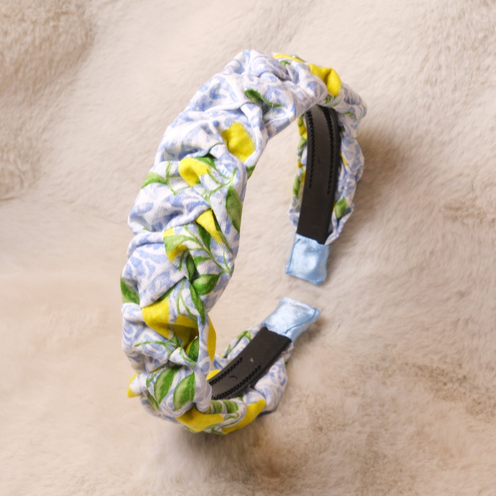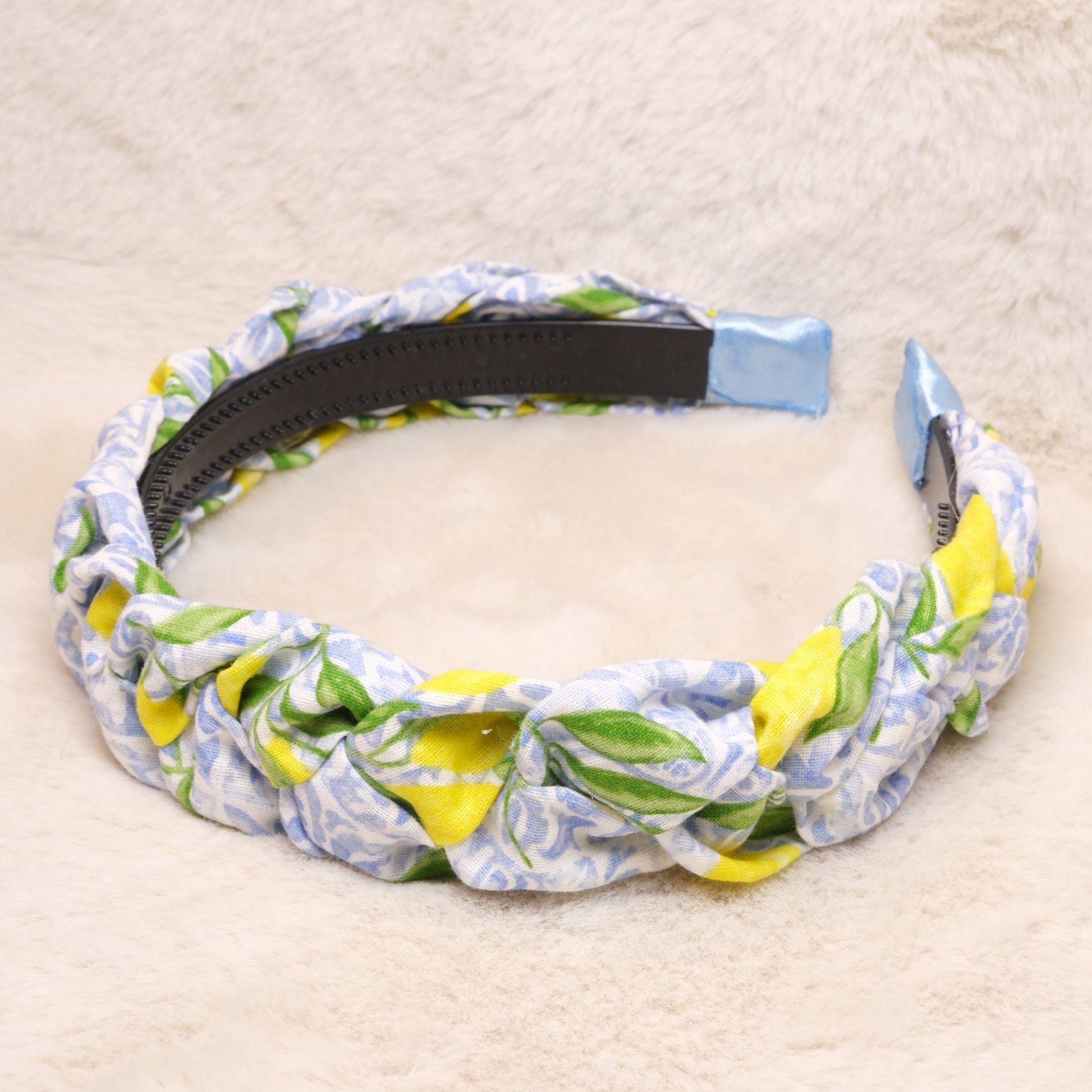 Pintas medvilnės lankelis su citrinomis ir šviesiai mėlynais raštais.