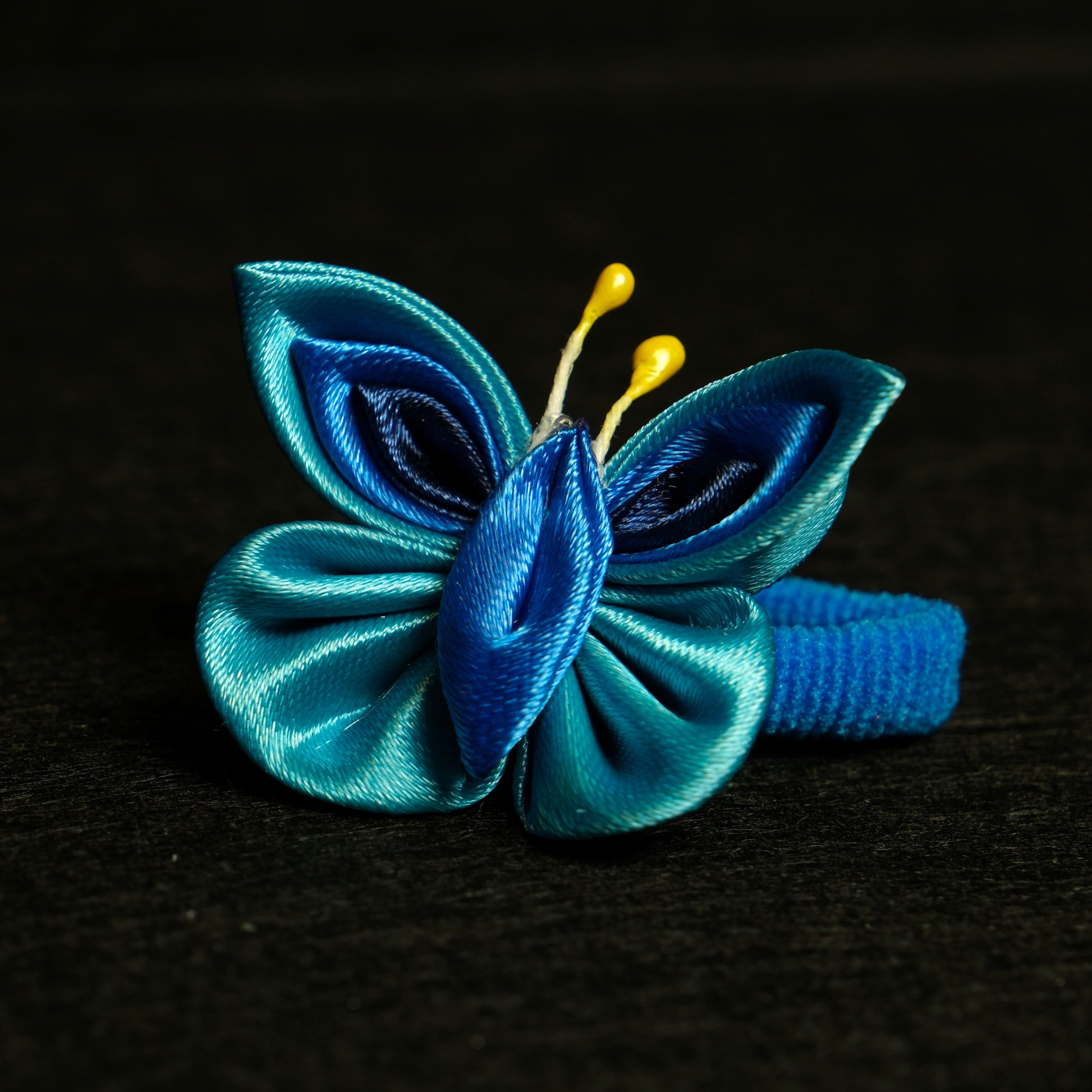 Žalsvai mėlynos spalvos vidutinio dydžio plaštakė ant gumytės.