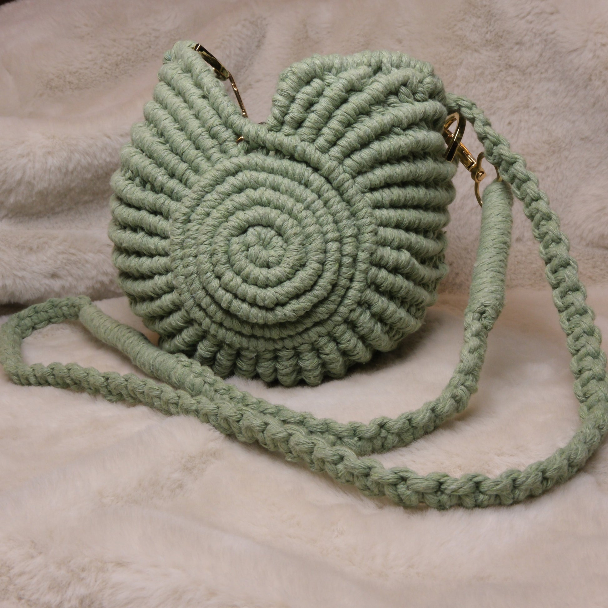 Švelniai žalios spalvos rankinukas sukurtas naudojant makramę (angl. macrame) mazgų rišimo techniką.