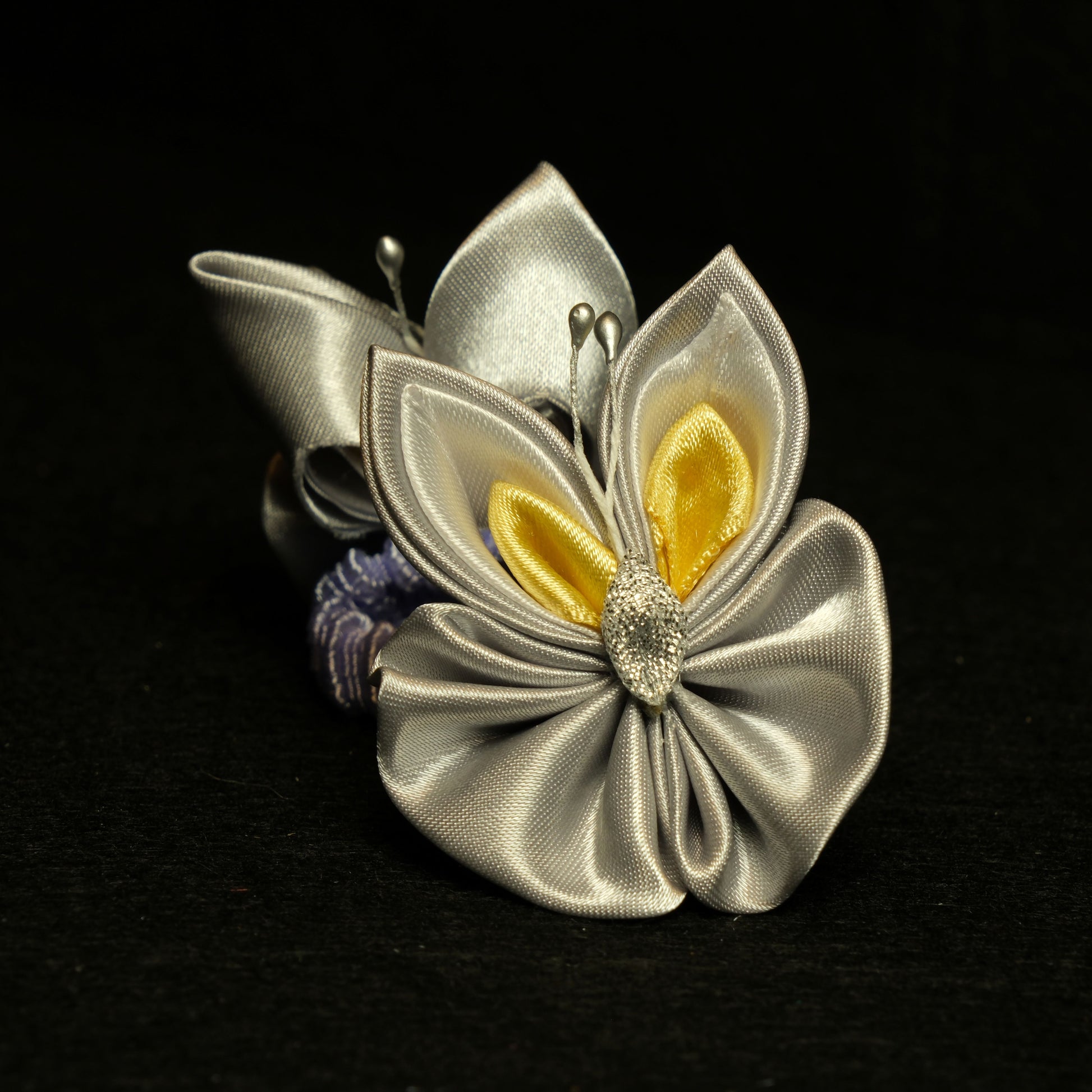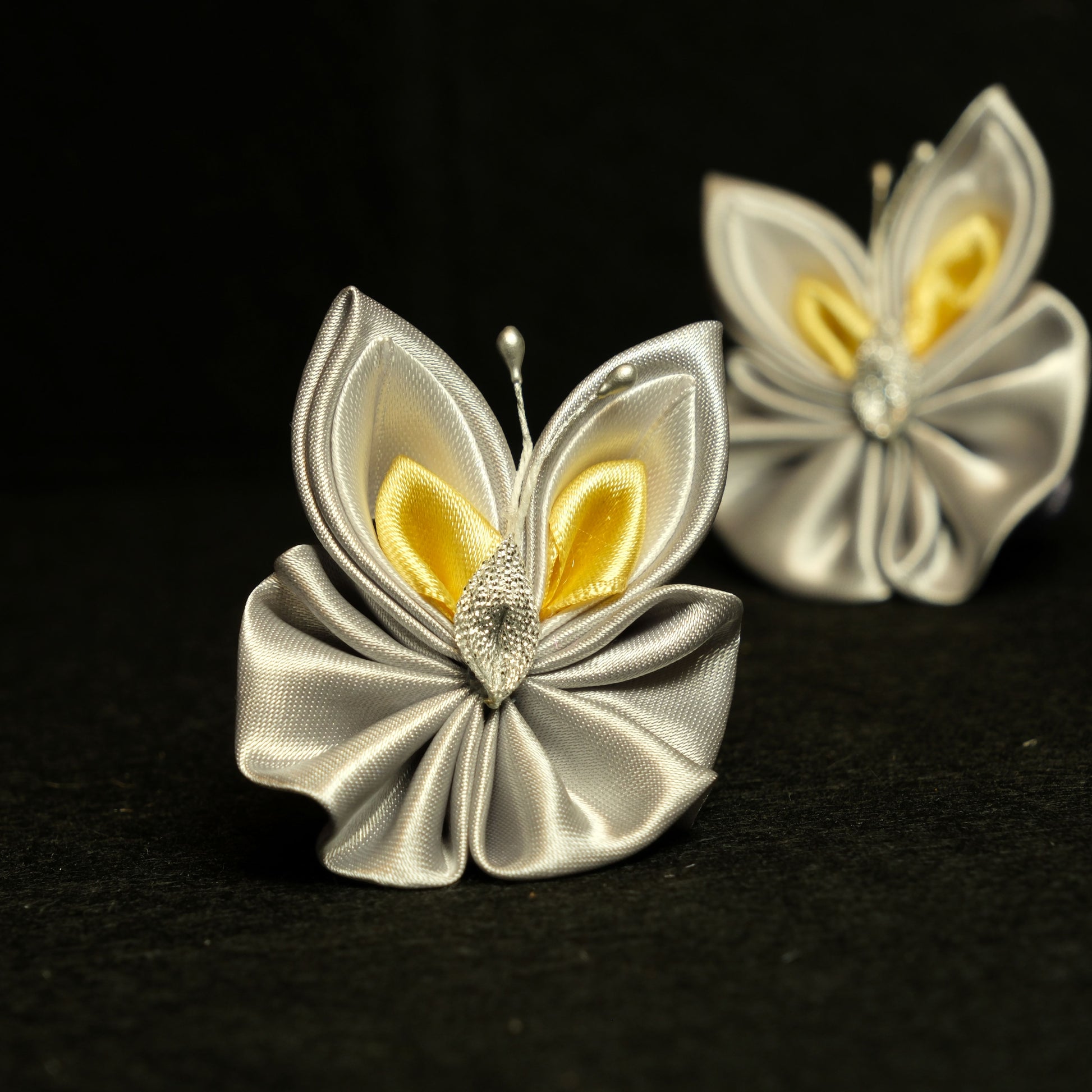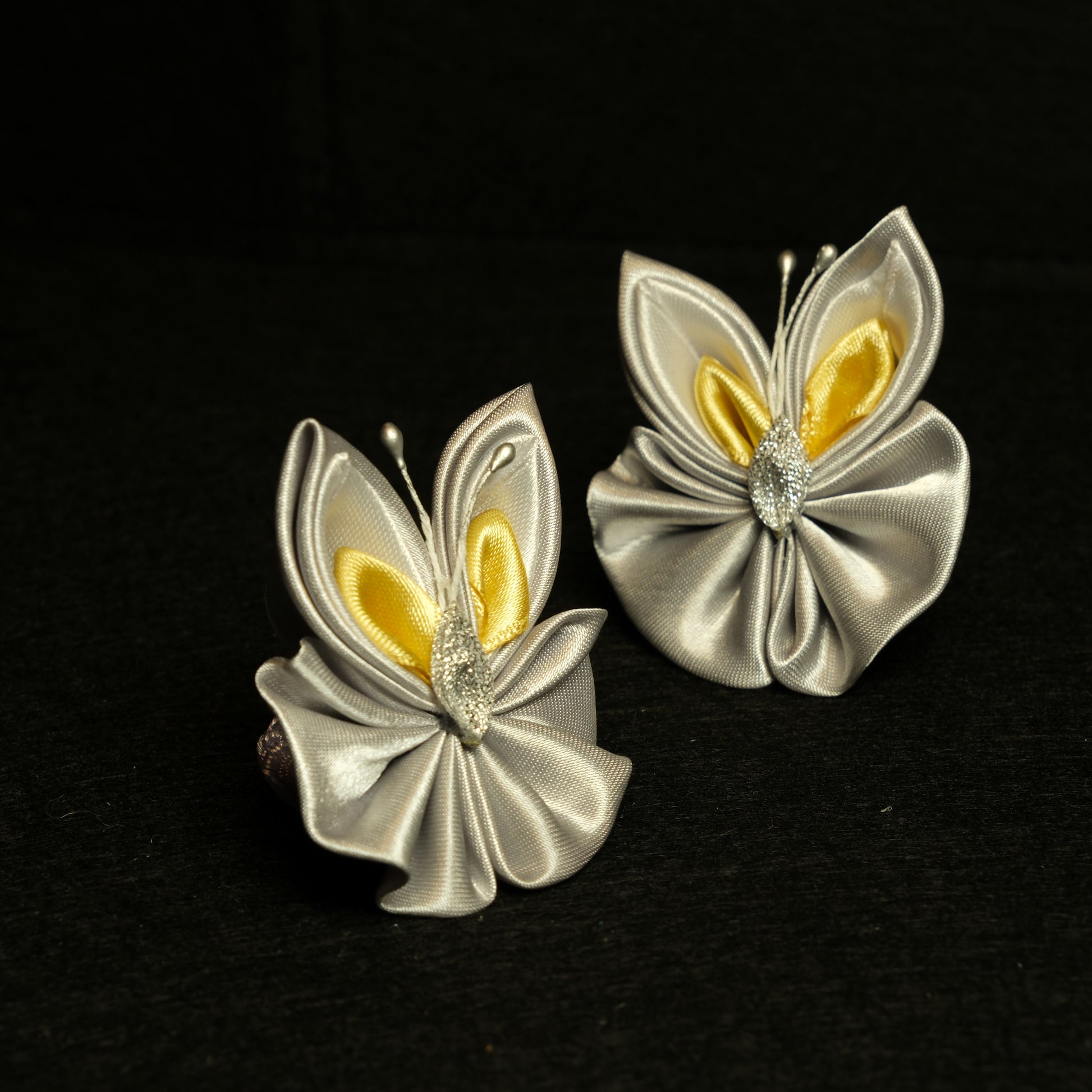 Sidabrinės spalvos drugelis ant plaukų gumytės.